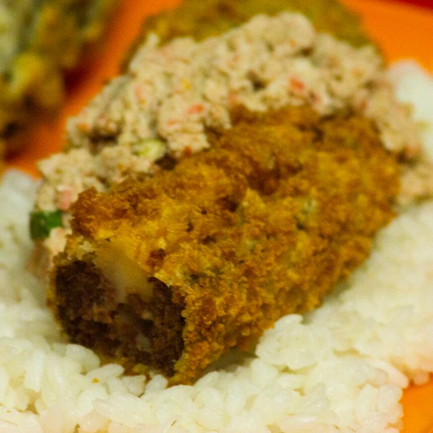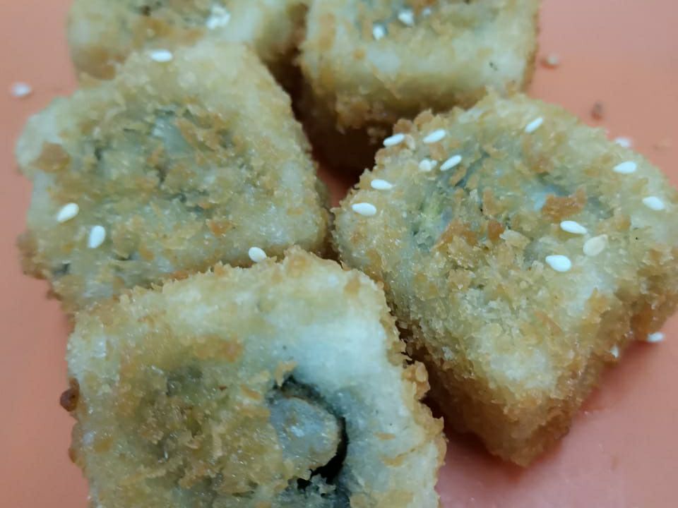 Rollo empanizado con queso manchego empanizado, arroz frito con verduras y alga por fuera.