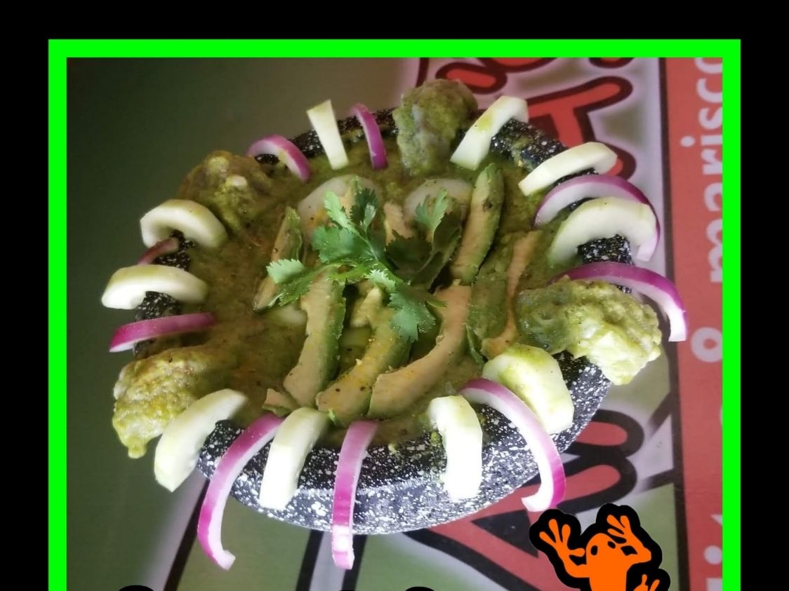 Hichsrron de sirlon con una ama de aguacate ,cebolla cambrayy unchile toreado , totopos o tostadas para acompañar