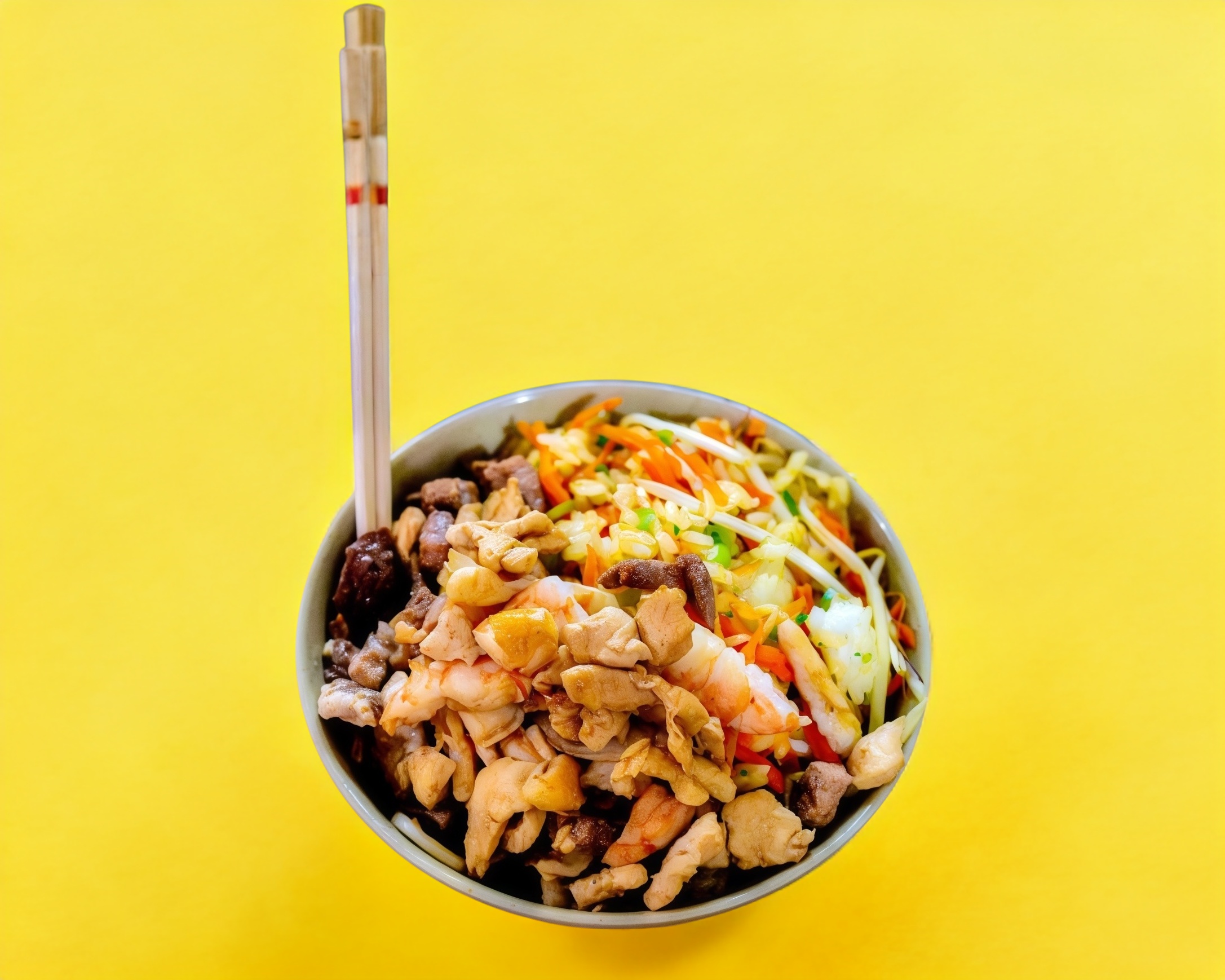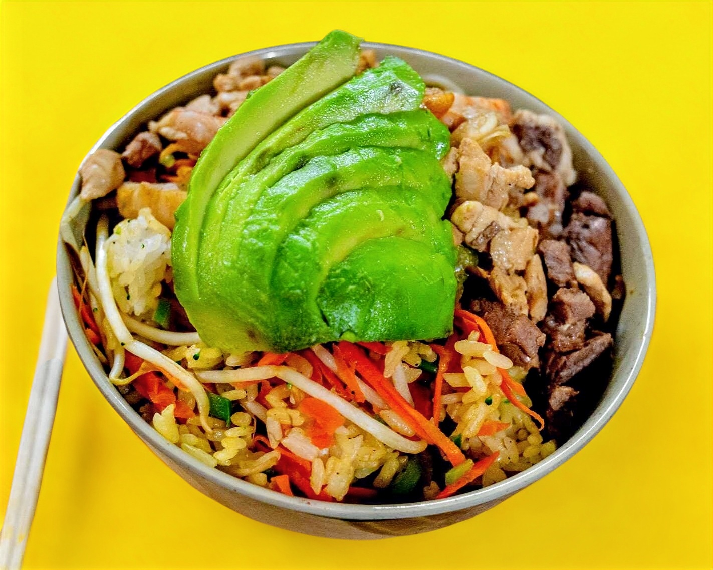 Arroz frito con zanahoria, germen de frijol, cebollin, apio, morròn, res y pollo