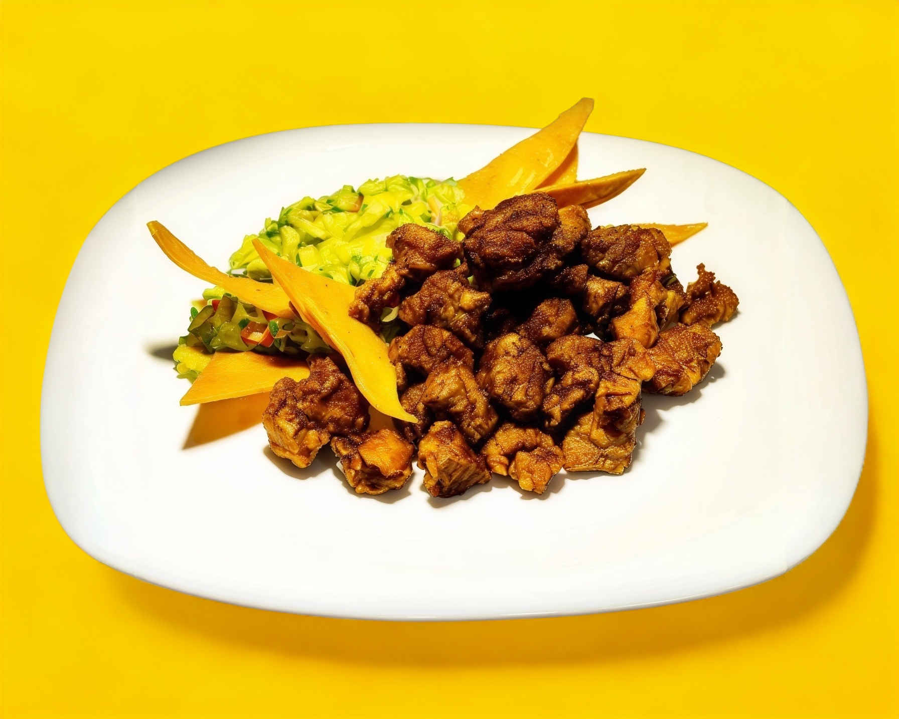 Marinado con salsa negra, acompañado de ensalada de guacamole y totopos.