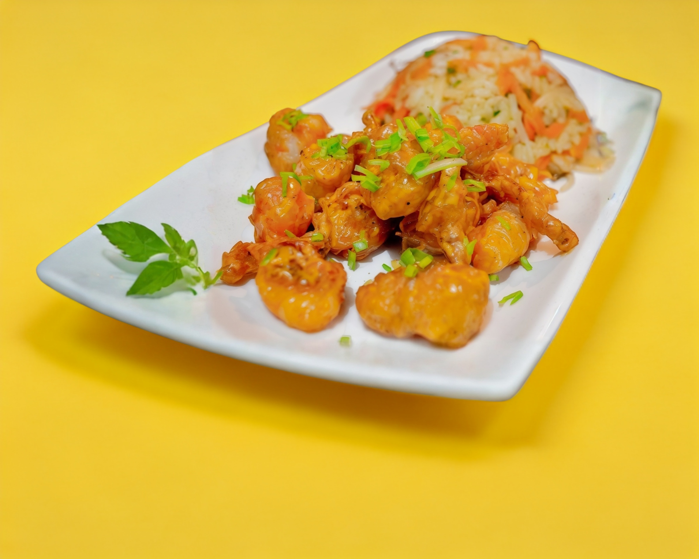 Camarones tempura bañados con salsa especial, acompañados de arroz con verdura.