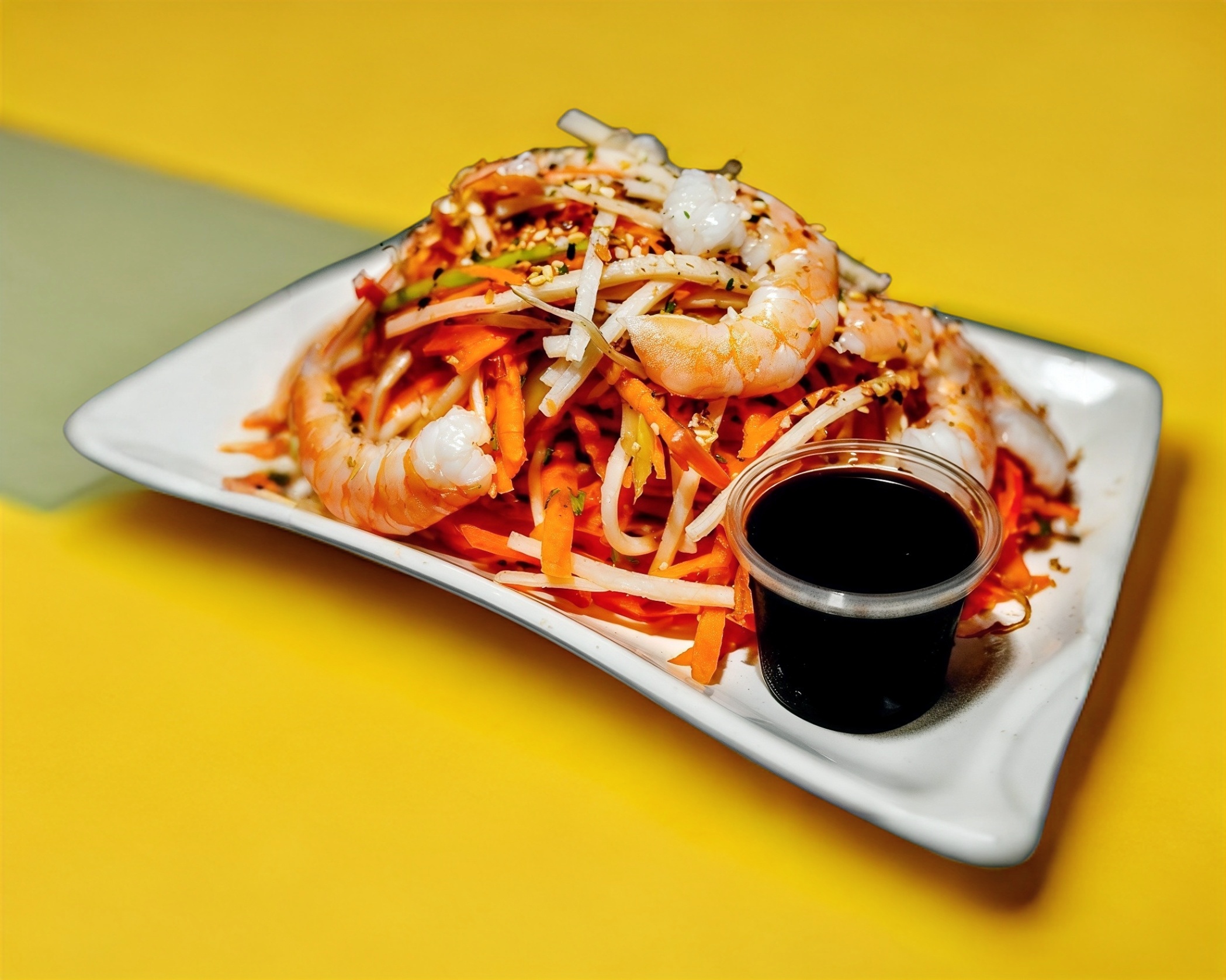 Ensalada sunomono, camarón, says, ajonjolí y furikake.