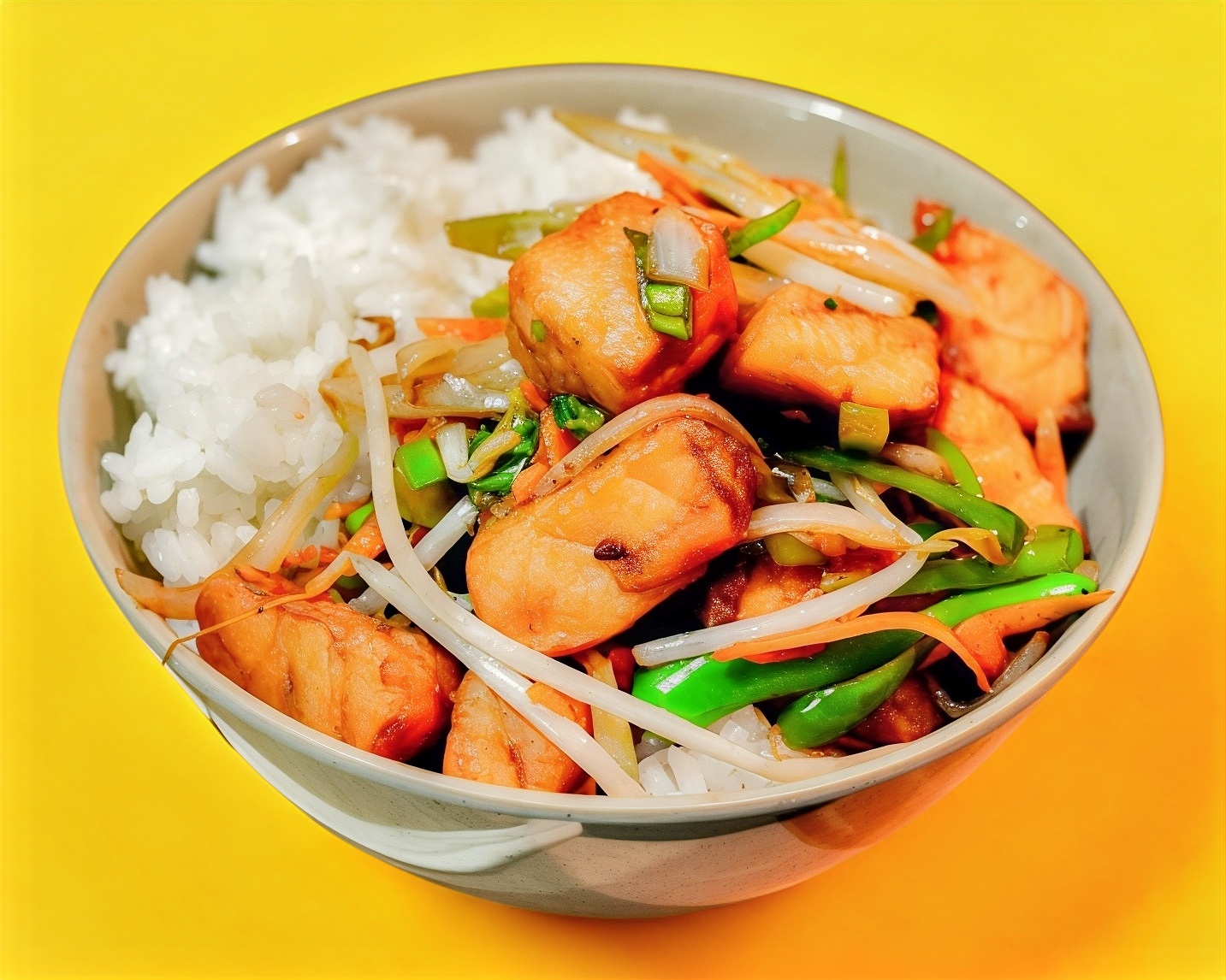 Salmón, cebolla, chile serrano, soya y una cama de arroz al vapor.