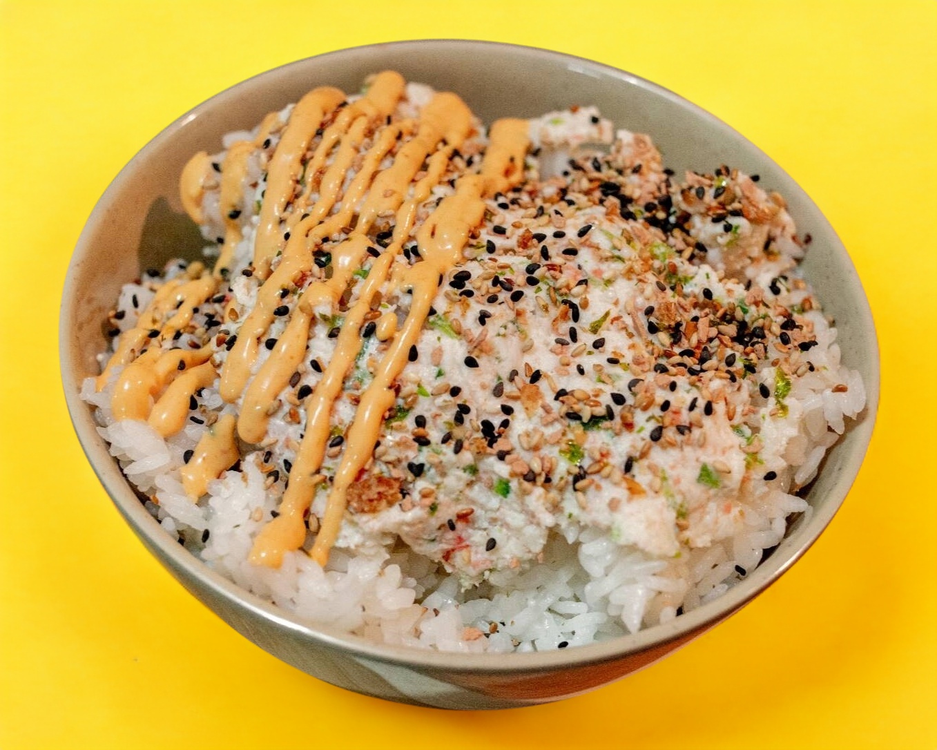Arroz al vapor con pasta tampico y furikake de camarón.