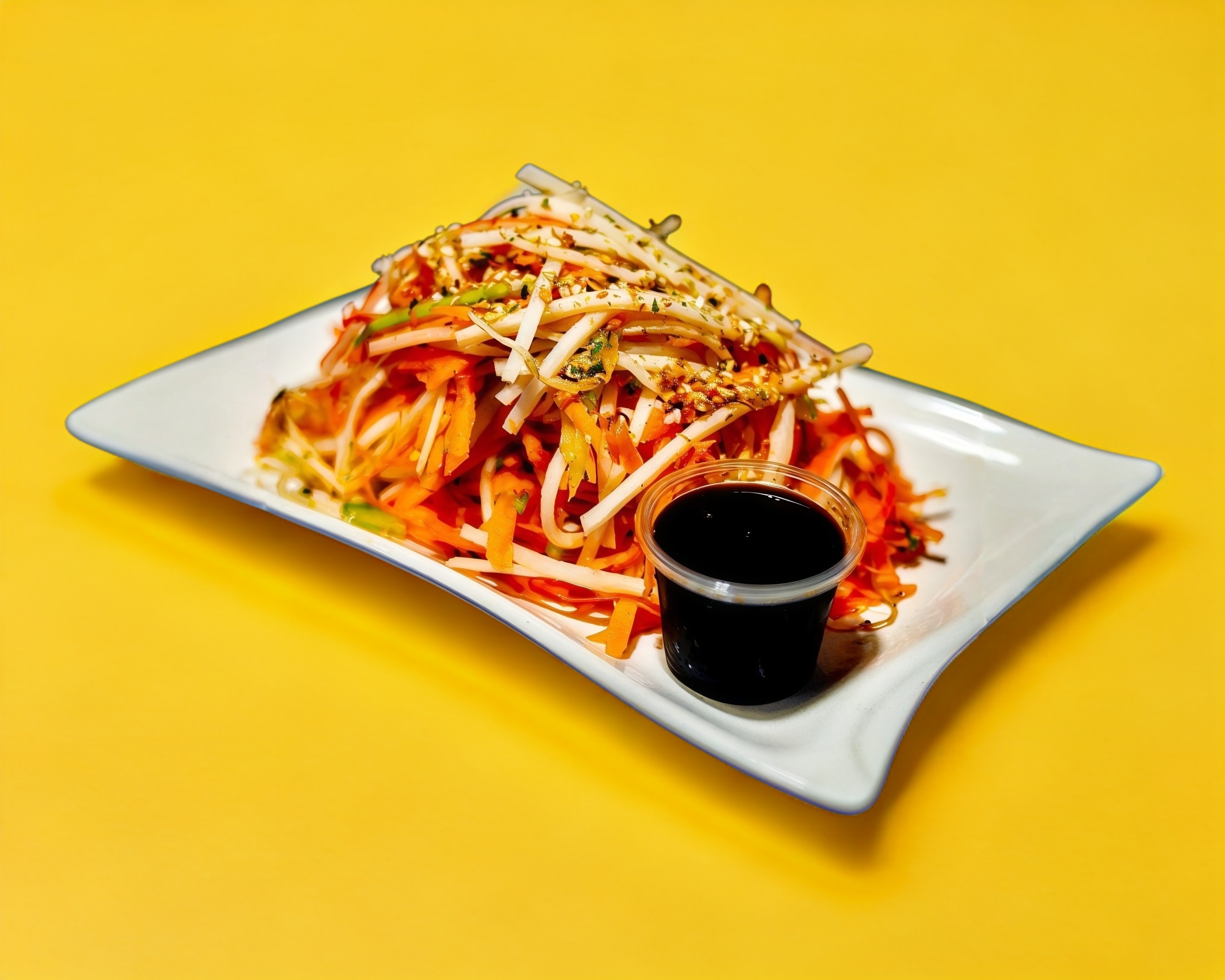 Pepino, surimi, zanahoria, morrón, germen, cebollín, soya, ajonjolí y furikake.