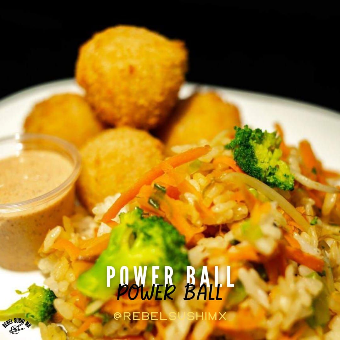5 bolitas capeadas rellenas de pasta tampico, manchego y camarón, acompañados de arroz con verdura.