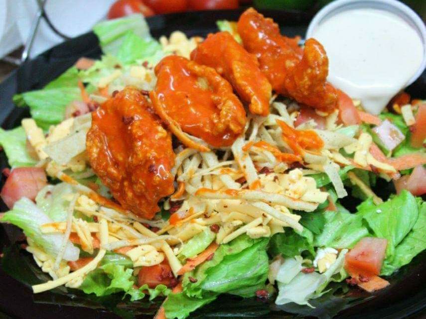 Lechugas mixtas, tomate picado, zanahoria rallada, queso chedar rallado, tocino deshidratado, tiritas de tortillas, pollo búfalo y acompañada de aderezo de la casa.