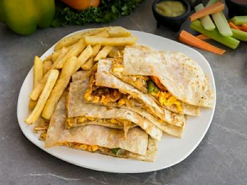 Tortilla de harina de 20 cm cortada en 4 partes con pimientos morrón, cebolla acitronada, mezclas de quesos mixtos, tocino dorado y cuadritos de pollo bañadas en salsa Búfalo.