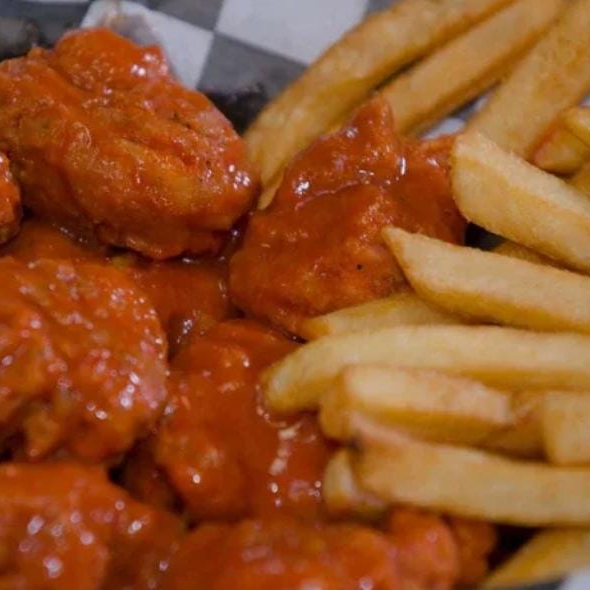 orden personales de 8 Boneles bañados en salsa BBQ acompañados de papas ala francesa y un dif de ranch y zanahoria