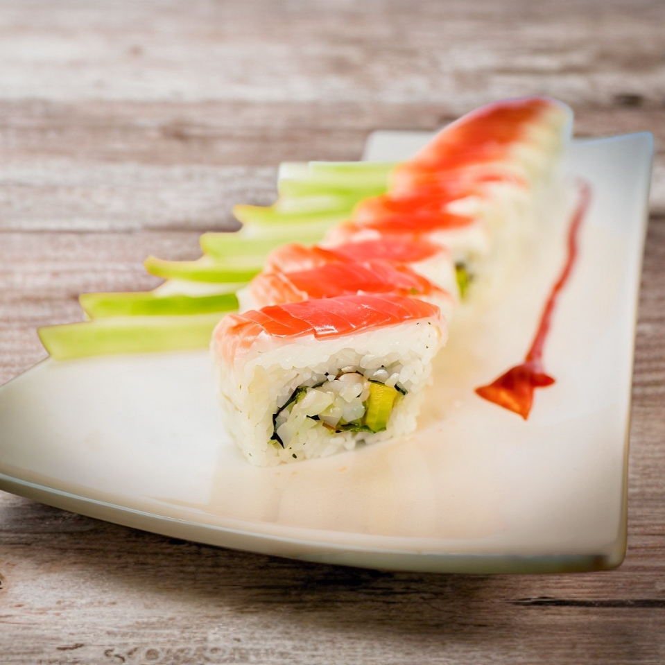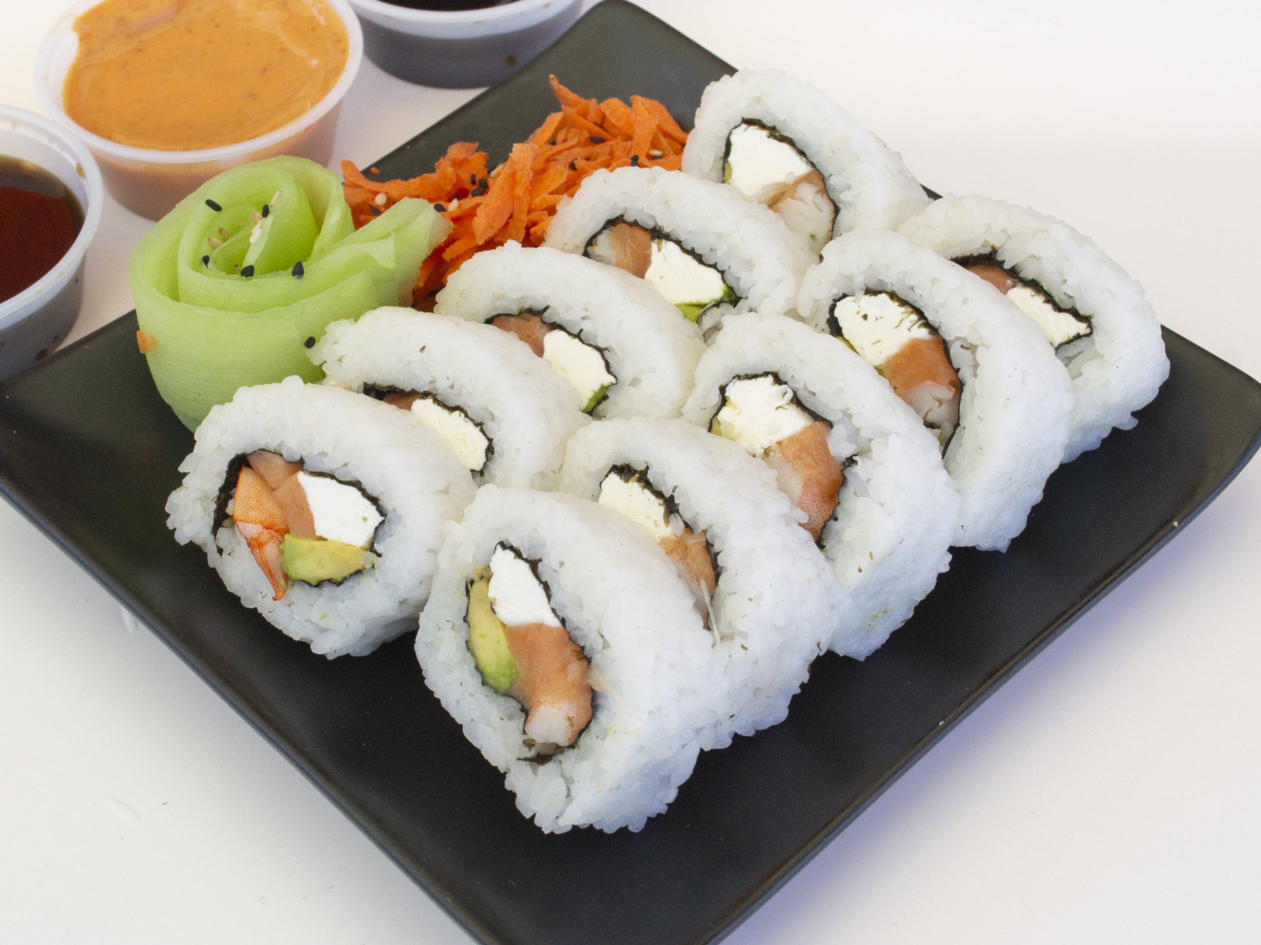 Rollo frío especial por dentro Salmón, camarón ,queso crema y aguacate y por fuera tampico