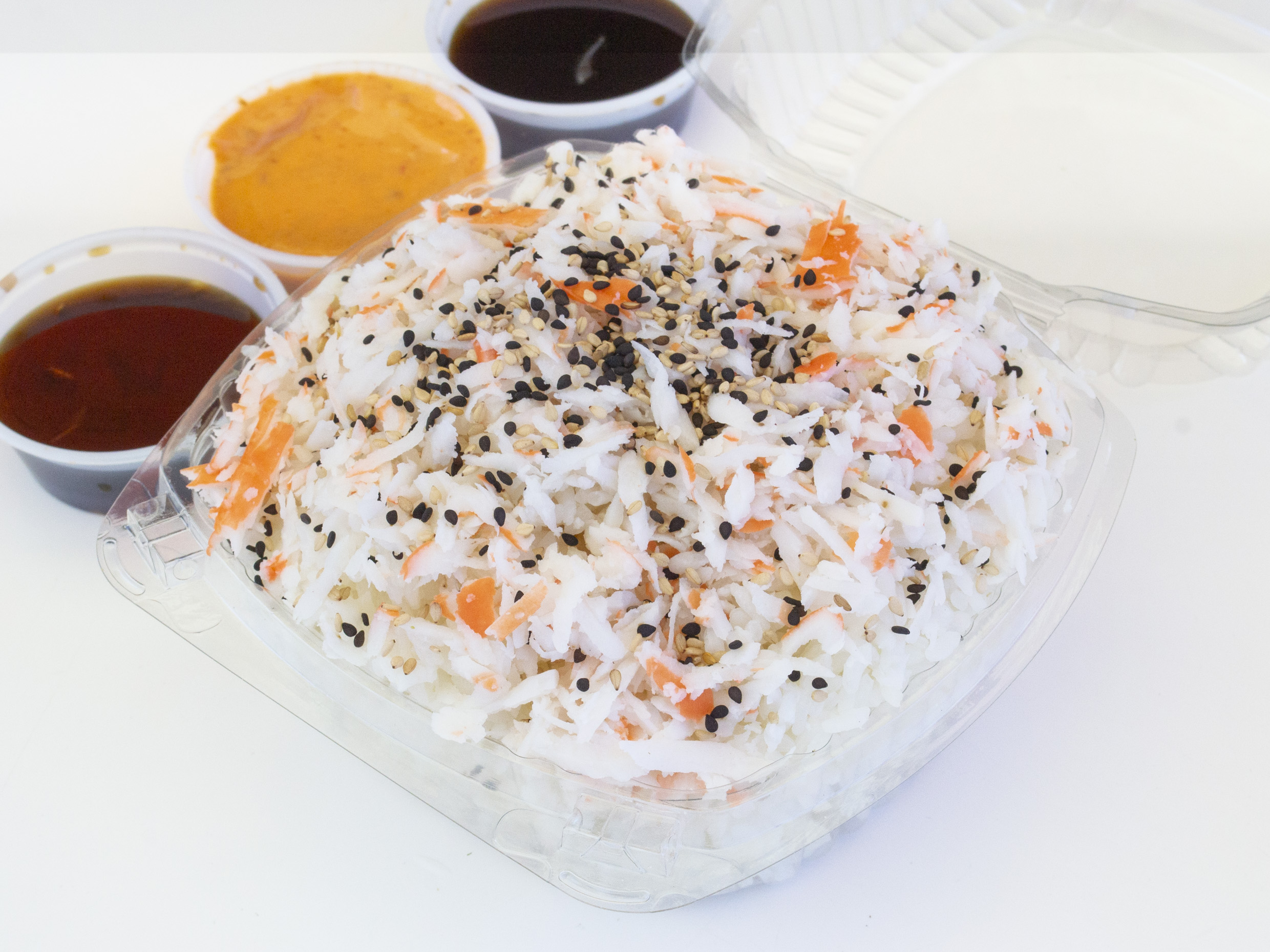 Arroz blanco al vapor, acompañado de surimi rayado y ajonjolí