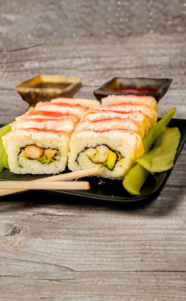 Camarón y aguacate por dentro, surimi y queso crema por fuera