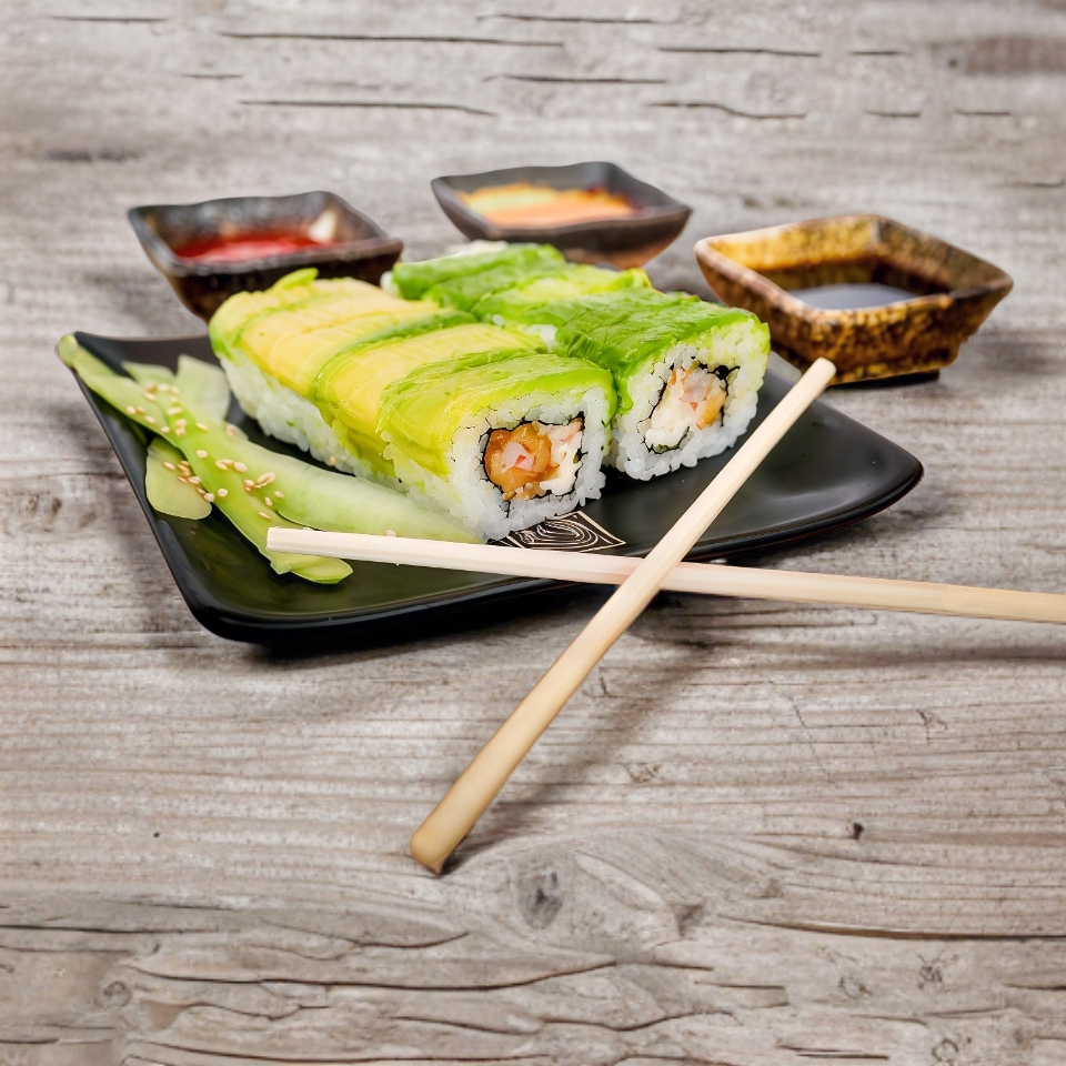 Surimi aguacate, queso crema y pepino envuelto en alga