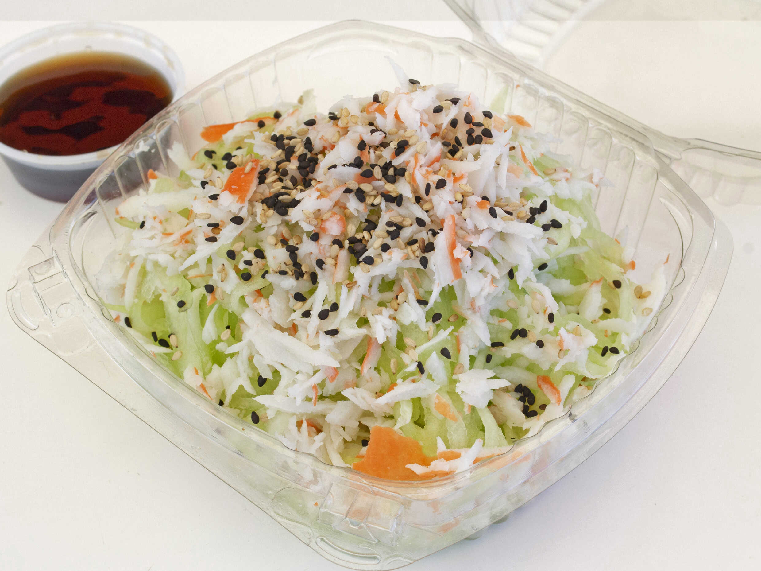 Ensalada japonesa de pepino, surimi, ajonjoli acompañado con una vinagreta