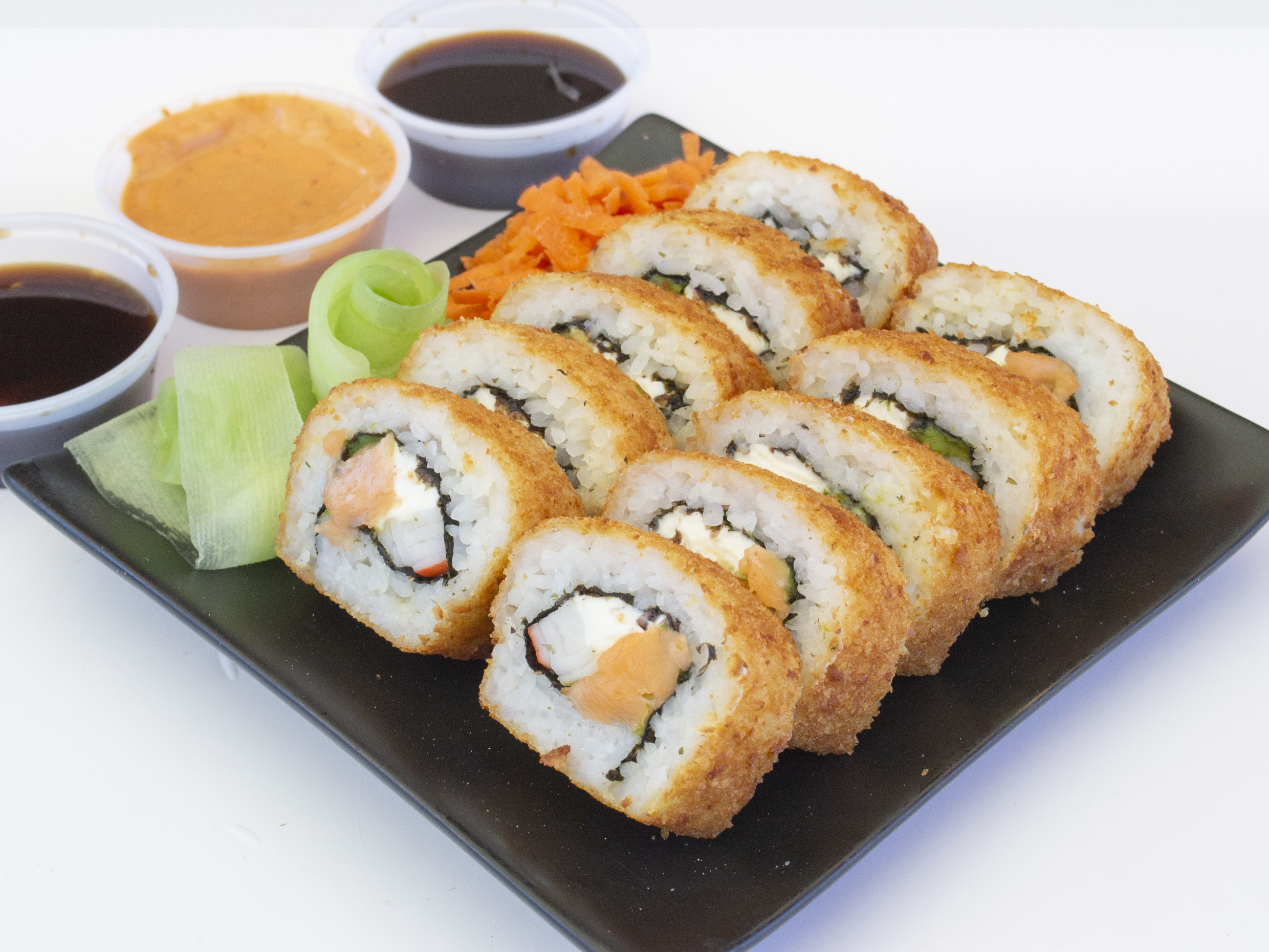 Salmón, surimi y queso crema rollo empanizado