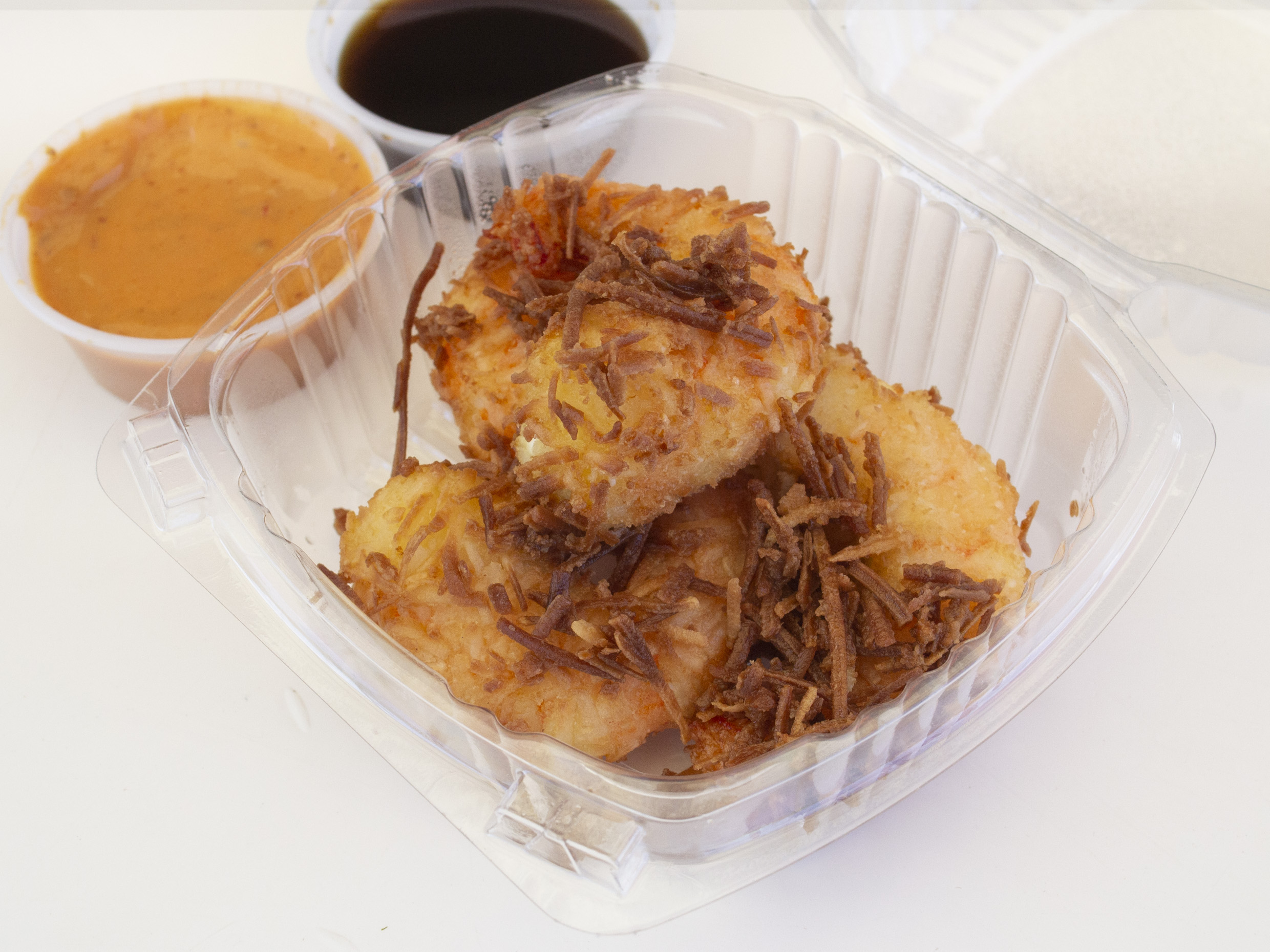 (4 camarones empanizados con coco, rellenos de queso crema)