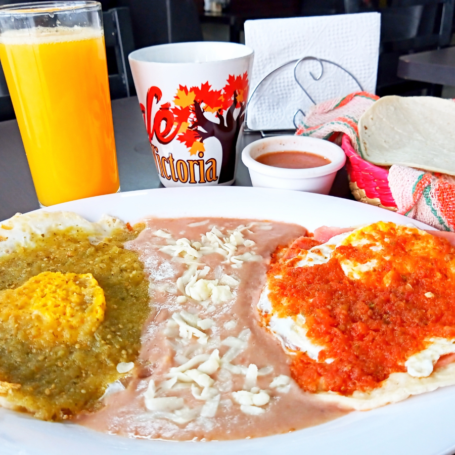 Dos huevos estrellados sobre una de tortilla bañados con salsa roja y salsa verde acompañados con frijoles refritos.
