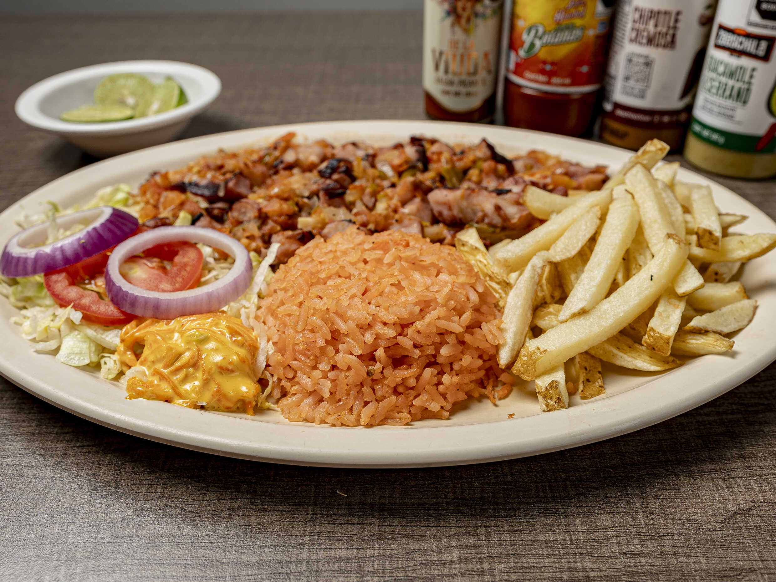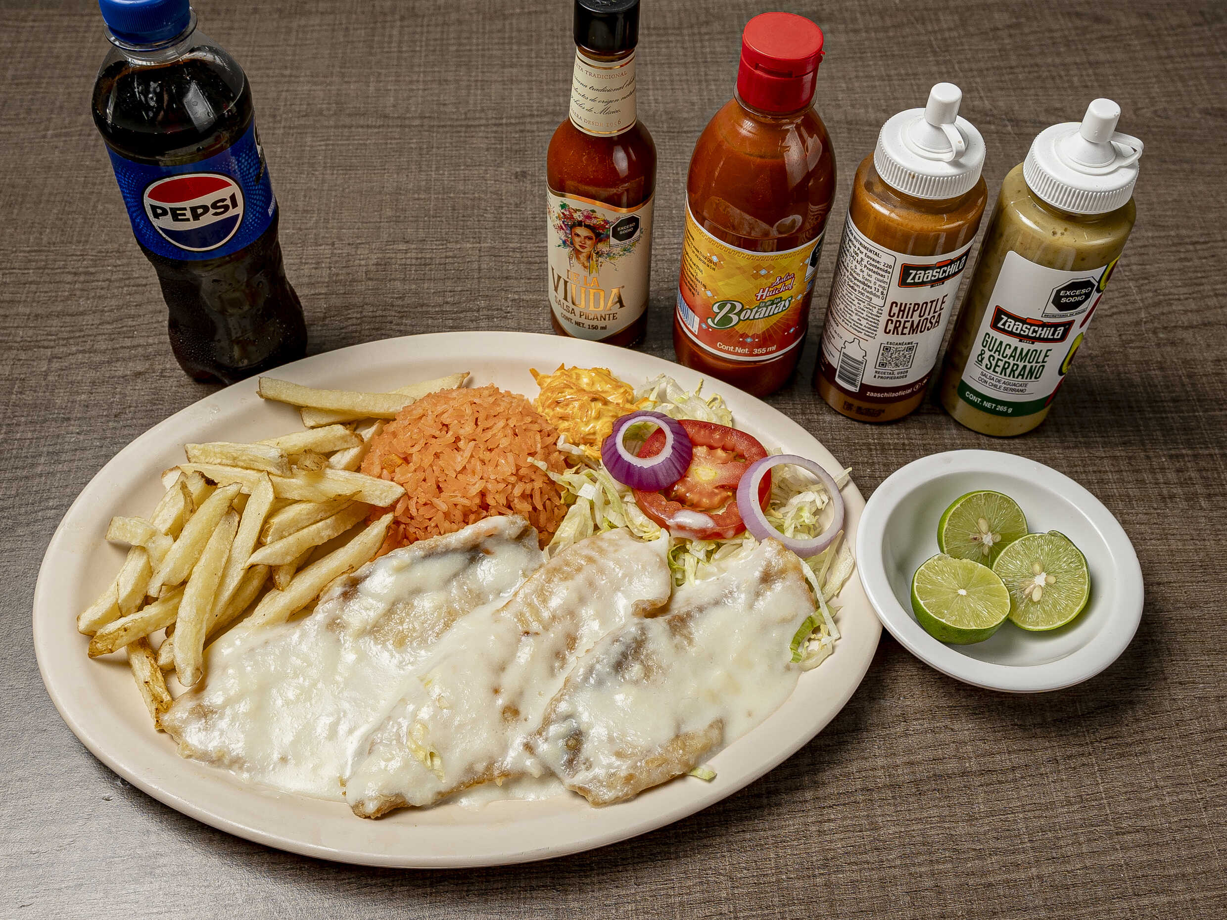 Guarnición arroz papas lechuga tomate cebolla aguacate aderezo. Incluye galletas Totopos lsobre de catsup sobre habanero limón y dulce