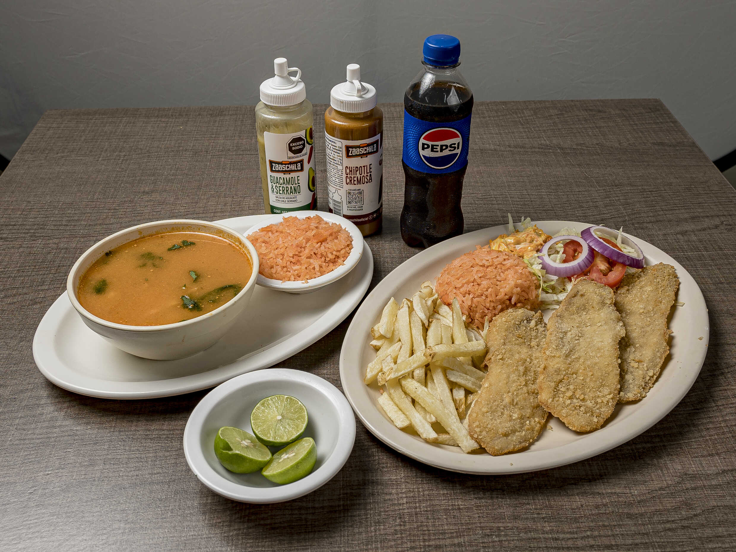 Caldo de pescado 🐠🐟 con filete de mojarracon arroz más 1 Pepsi de 355 ml incluye galletas y totopos