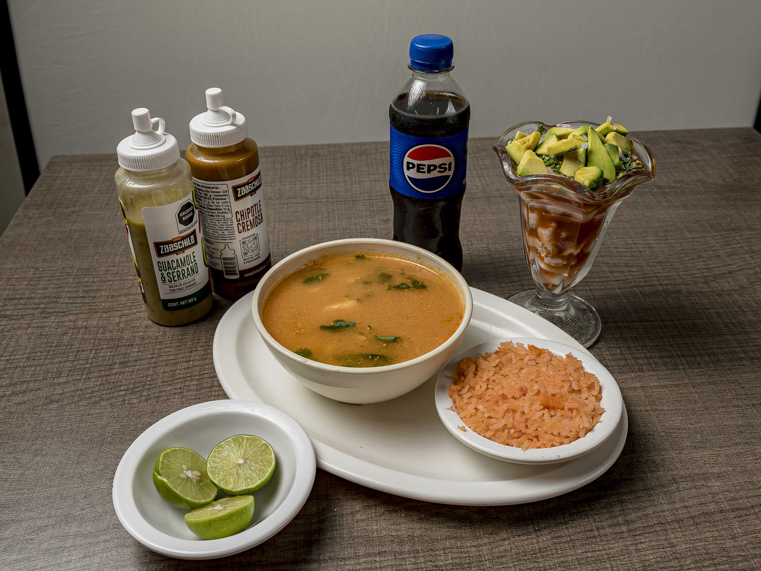Salsa catsup cilantro cebolla y aguacte .comprometo lleva galletas saladitas 4 Salsa habanera un sobre limón