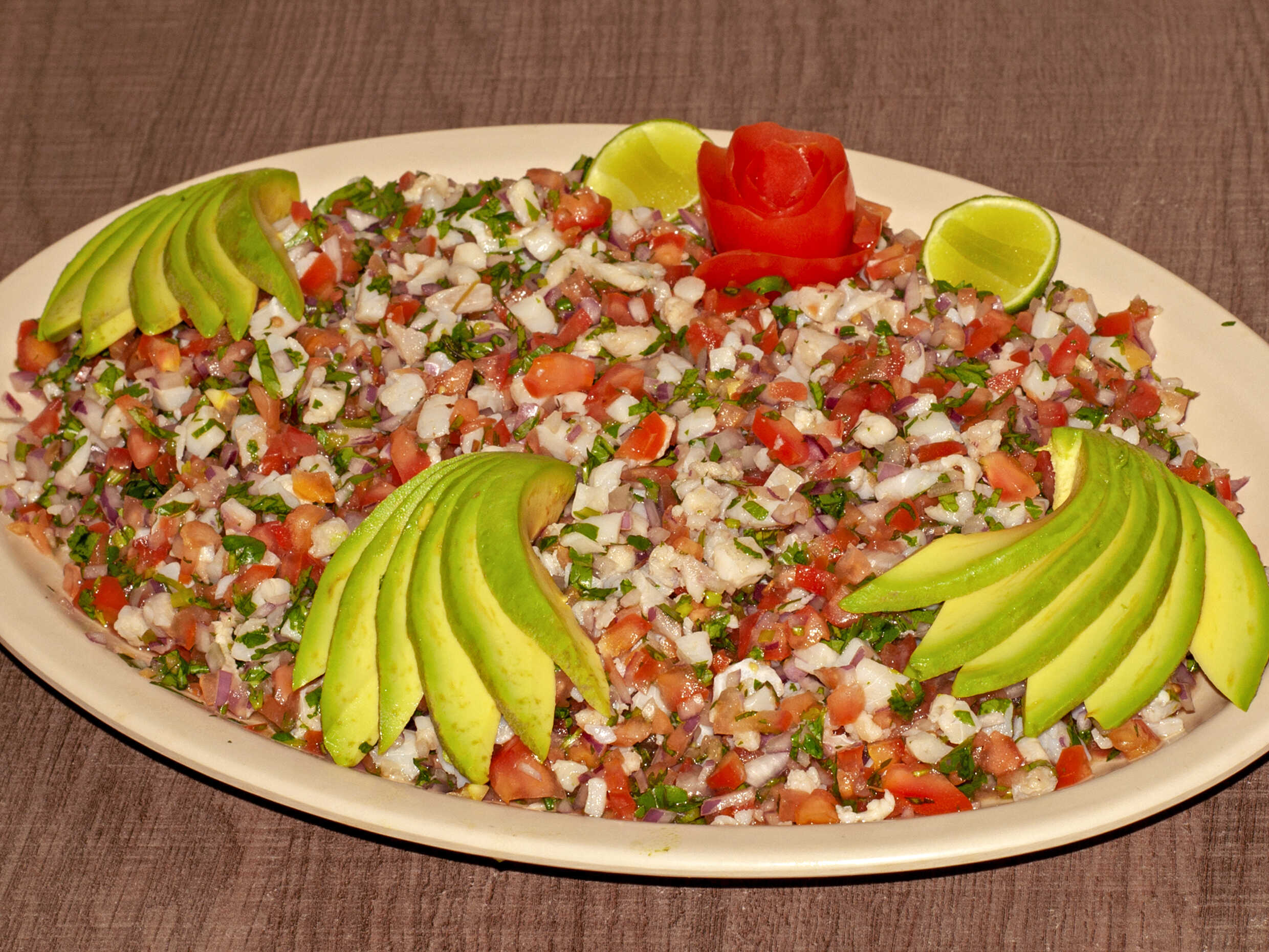 Ceviche cebolla cilantro tomate aguacate Incluye 5 tostadas sobre de salsa habanera
