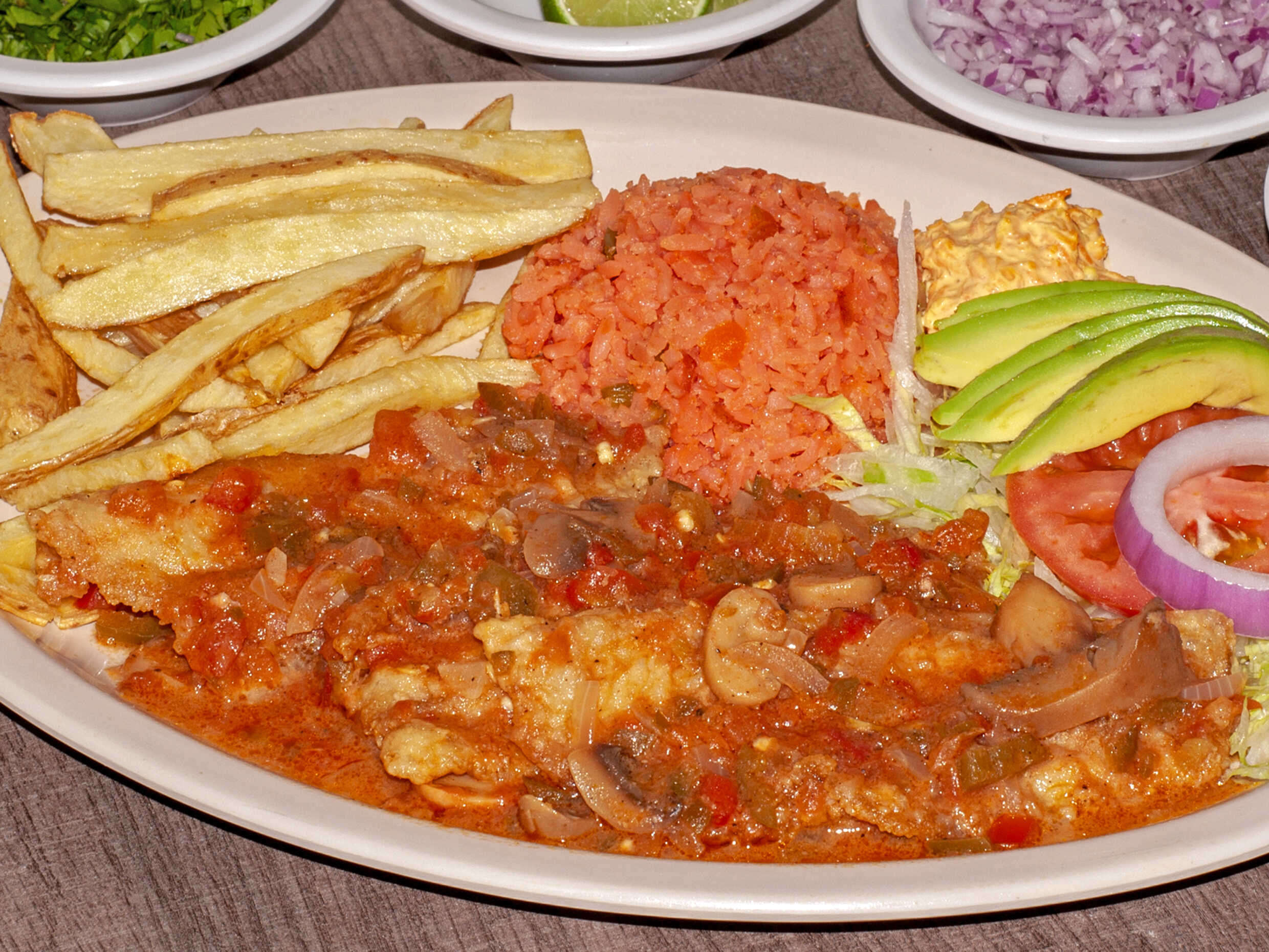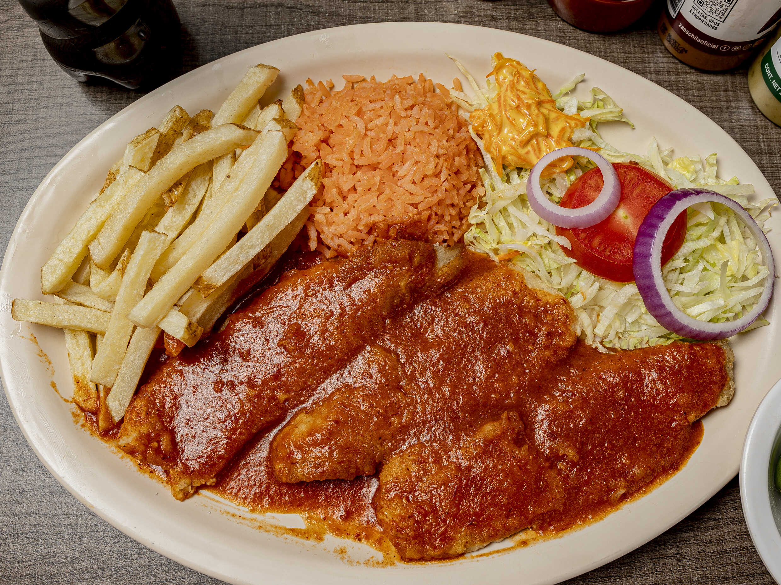 Órden de 3 filetes bañado en salsa a la mexicana receta de la casa acompañando con arroz papas aderezo Incluye galletas totopos sobre de catsu sobre de habanero tenedor y servilleta