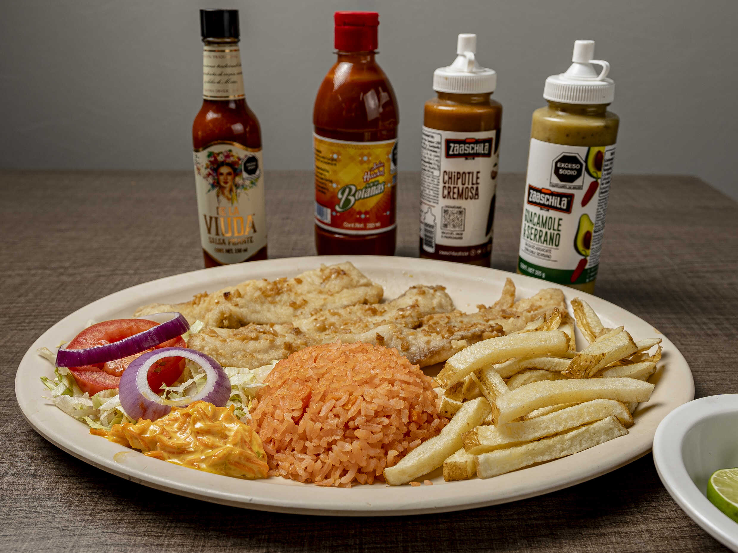 Guarnición arroz papas aderezo lechuga tomate cebolla aguacate, Incluye totopos galletas sobre de habanero sobre de catsup limón y dulce