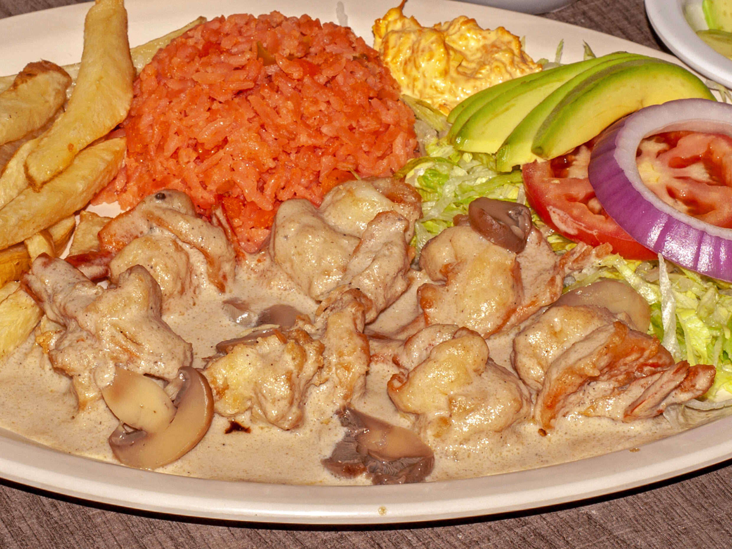 Órden de 3 filetes bañado en crema de champiñones receta de la casa acompañando con arroz papas aderezo Incluye galletas totopos sobre de catsu sobre de habanero tenedor y servilleta