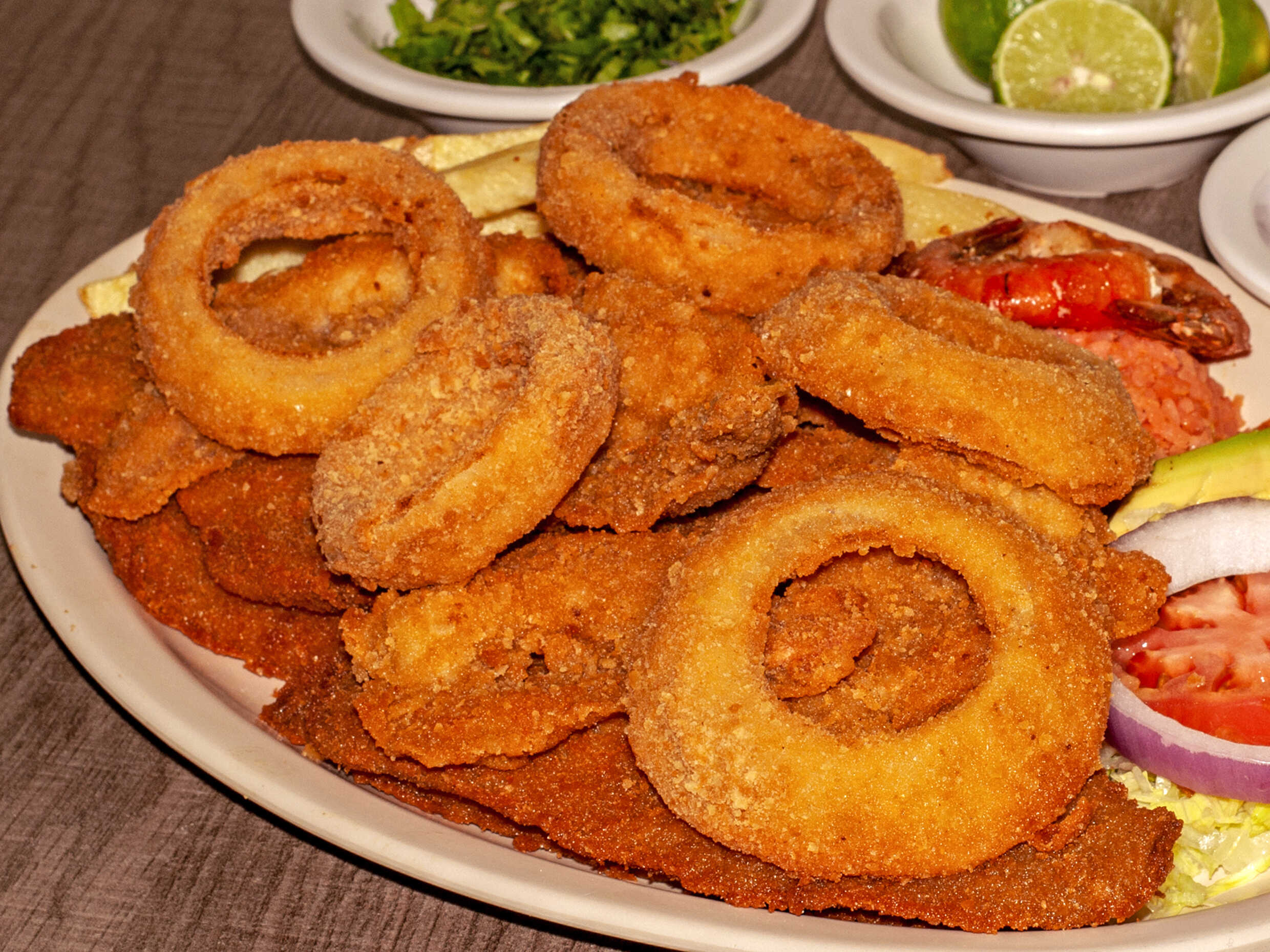 12 Filetes 12 Camarones 4 camarones Macuiles 6 aros de cebolla 1 Mojarra en postas 1 aderezo papas y arroz