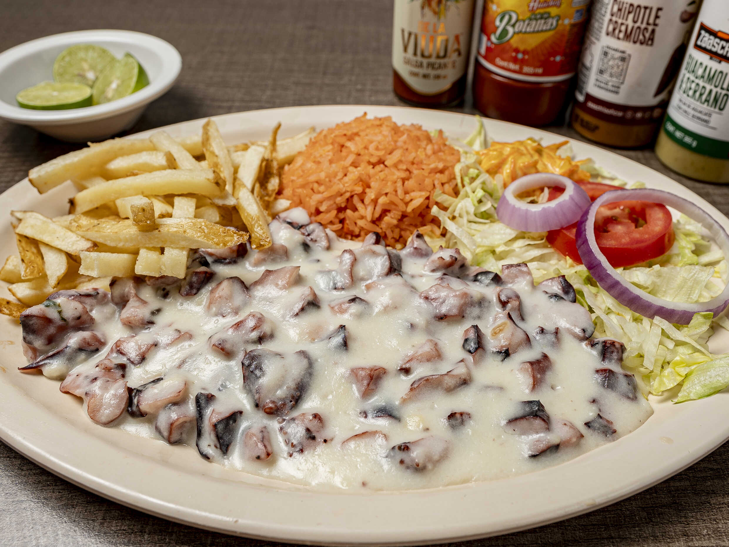 pulpo guisado con tomate cebolla ajo y chile. guarnicion lechuga tomate cebolla aderezo.inclkuye totopos galletas sobre de habanero y limon