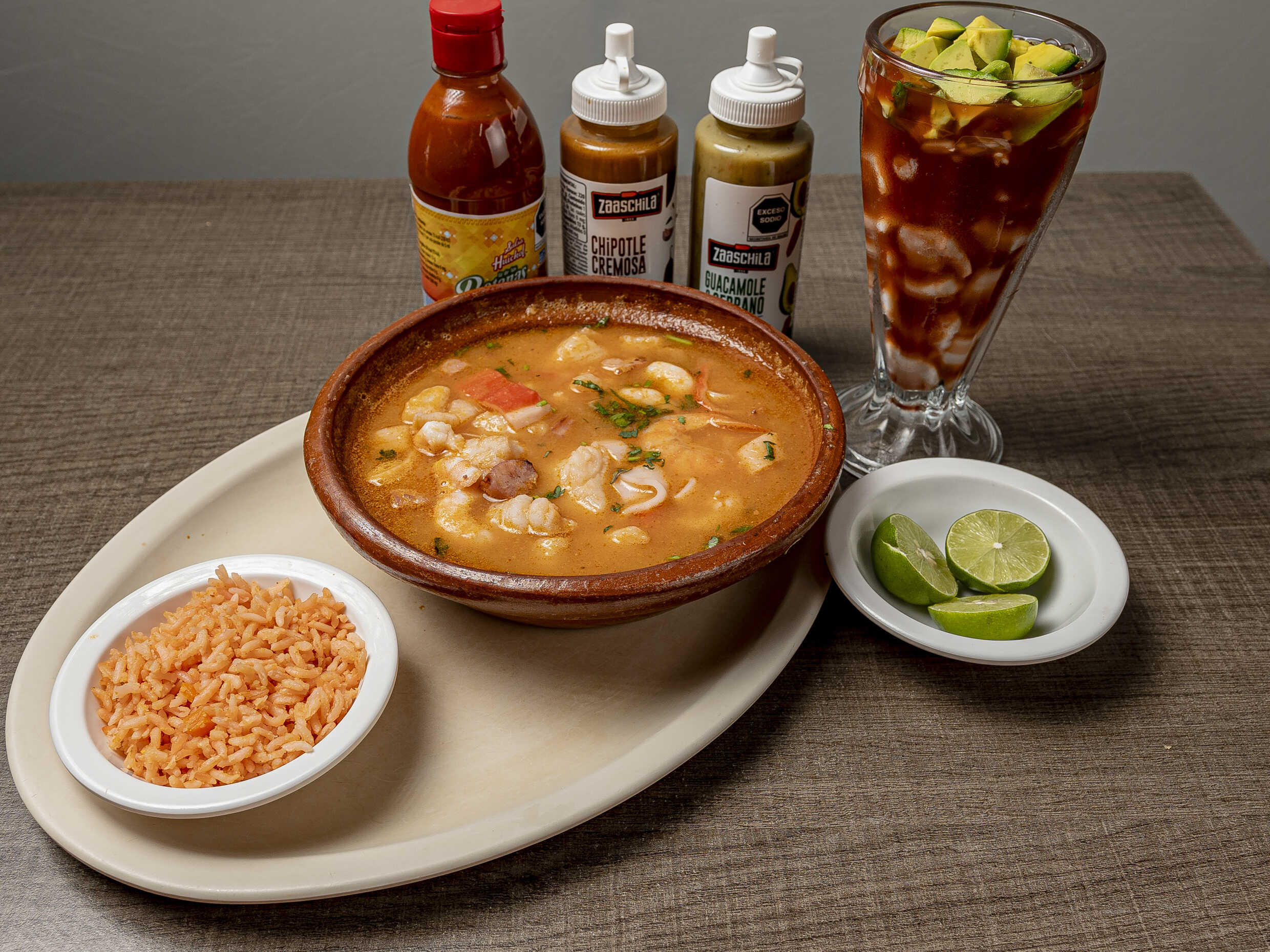 Camarón Pescado surimi callo d` hacha pulpo macuil chipotle y Chile verde .Incluye galletas Totopos habanera limón 🍋