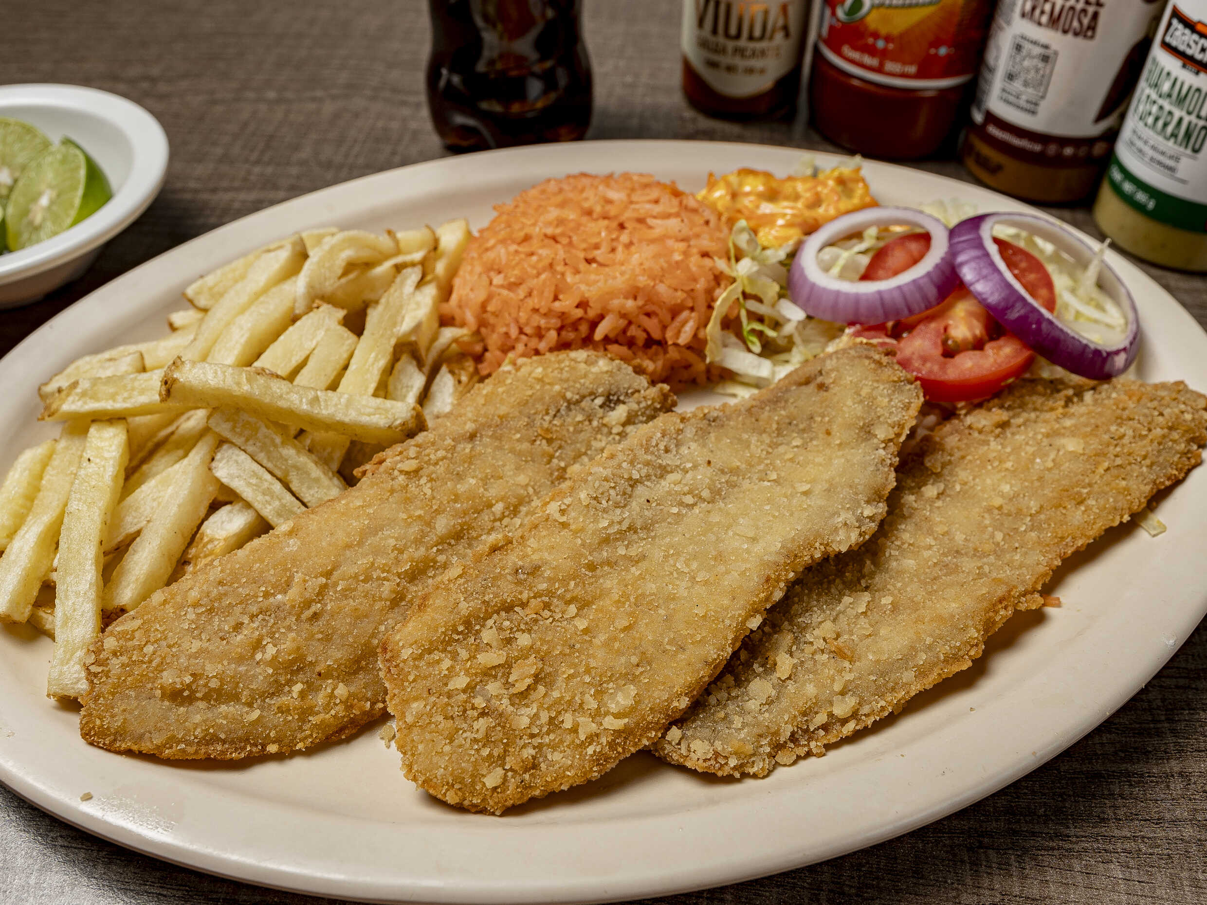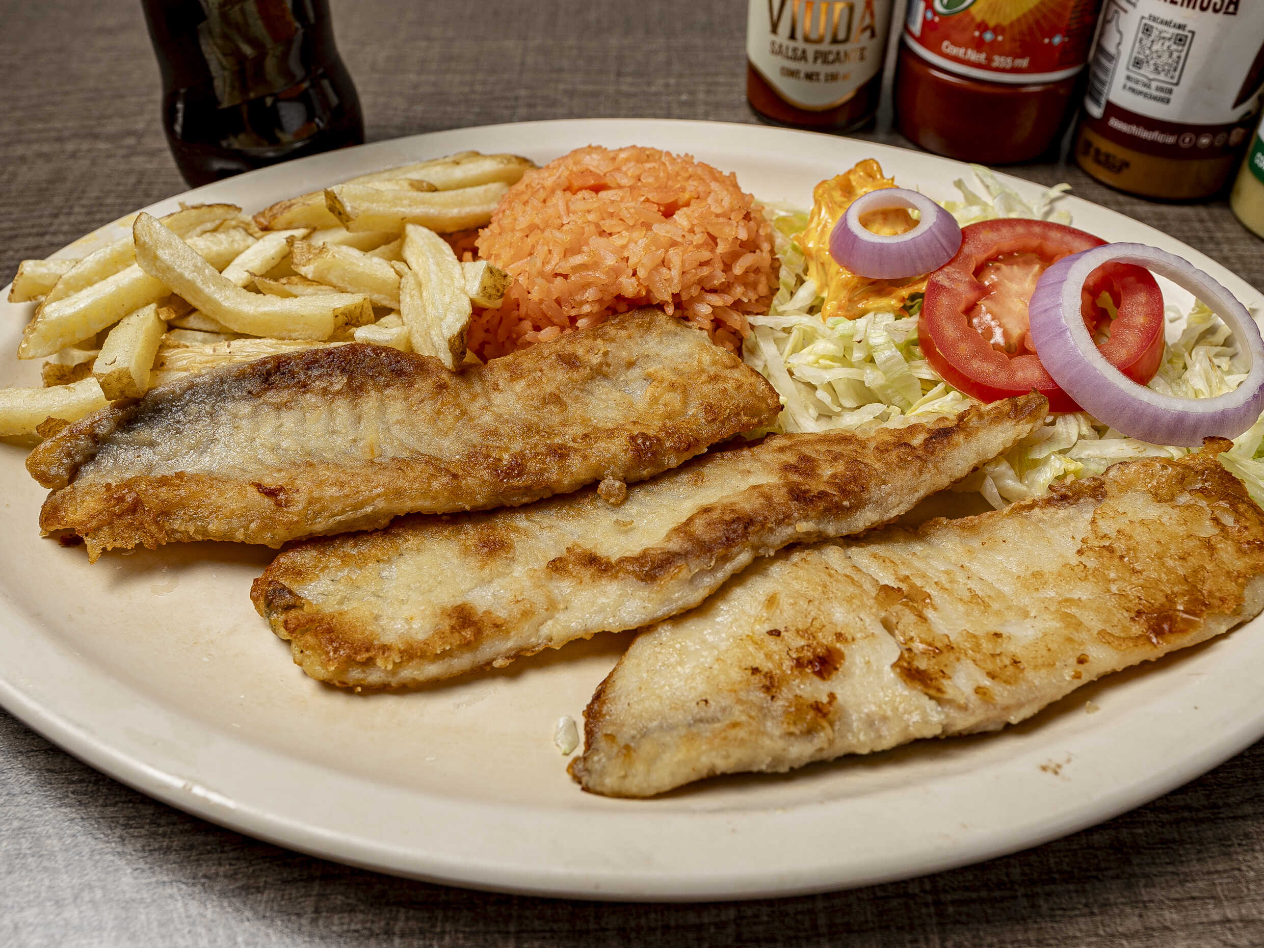 Orden de filete Guarnición arroz papas ensalada de lechuga 🥬 tomate 🍅 cebolla 🧅 y aderezo incluye galletas sobres de salsas y limón 🍋