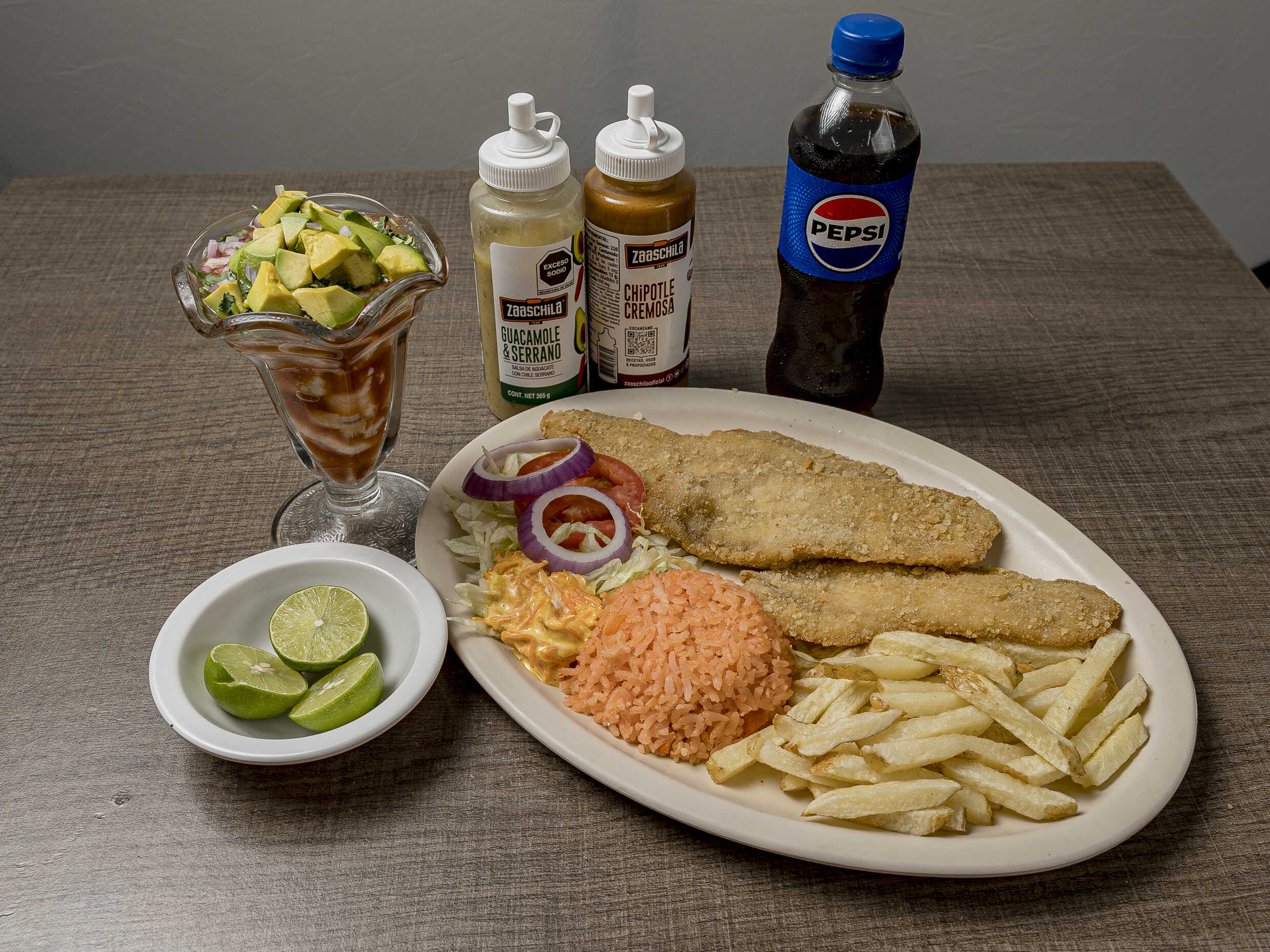 4 Filetes 3 camarones 1 macuil 2 arros empanizados papas aguacate tomate lechuga cebolla aderezo . Inicluye galletas Salsa habanera limón es y dulce