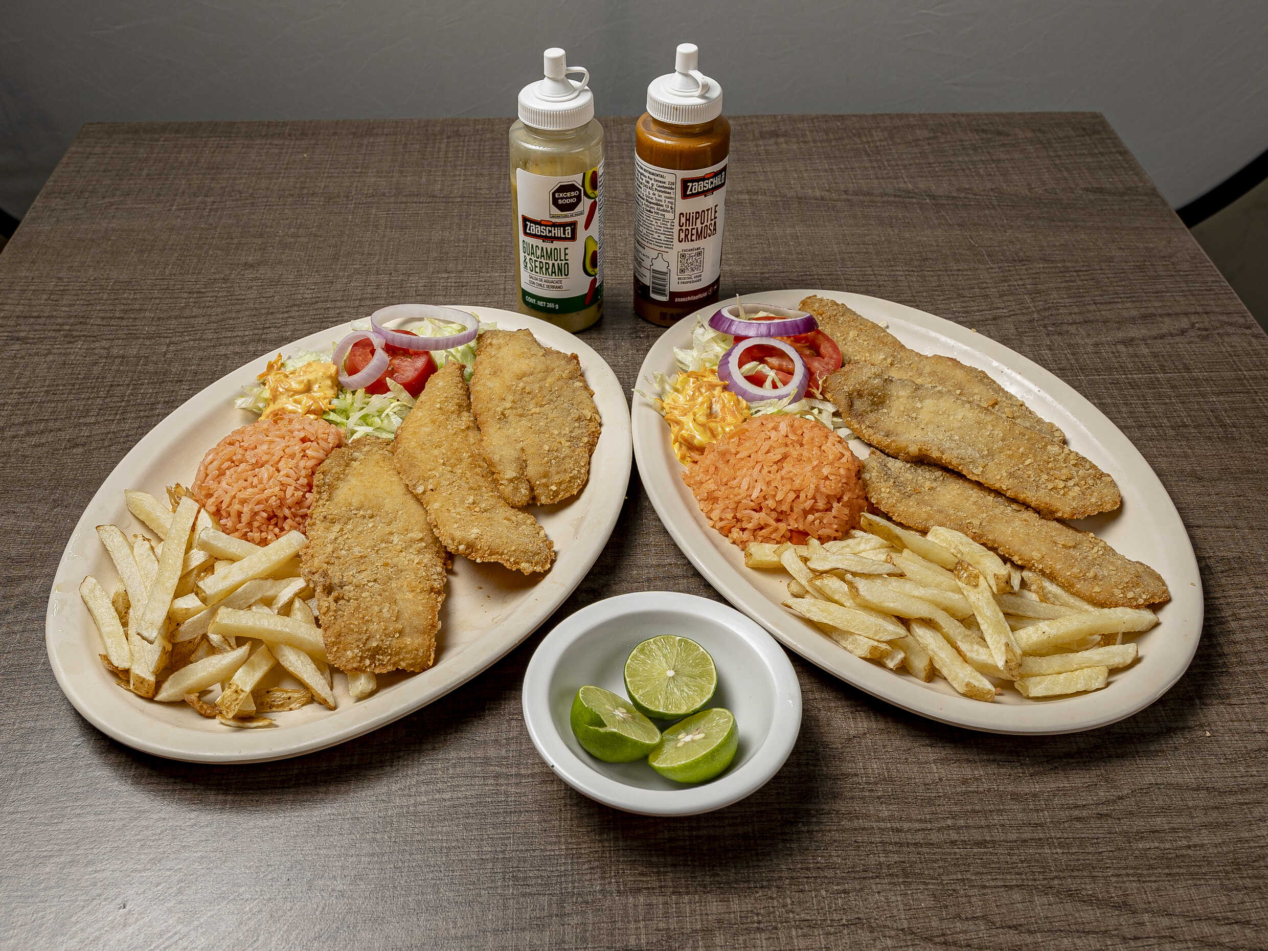 Órden de 3 filetes bañado en crema de chipotle receta de la casa acompañando con arroz papas aderezo Incluye galletas totopos sobre de catsu sobre de habanero tenedor y servilleta