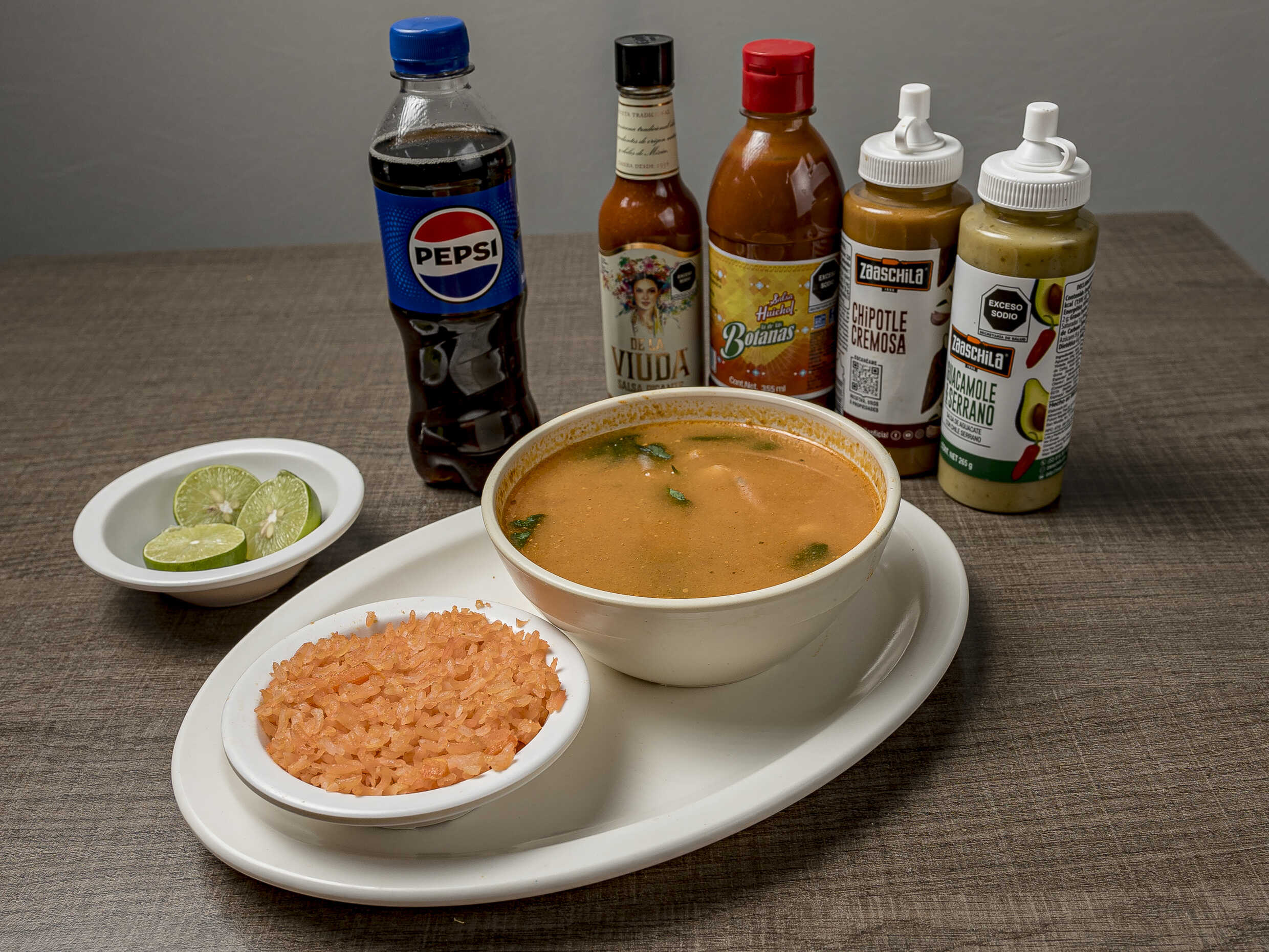 salsita con tomate cebolla ajo chile champinones. guarnicion lechuga tomate cebolla arroz papas.incluye totopos galletas limon