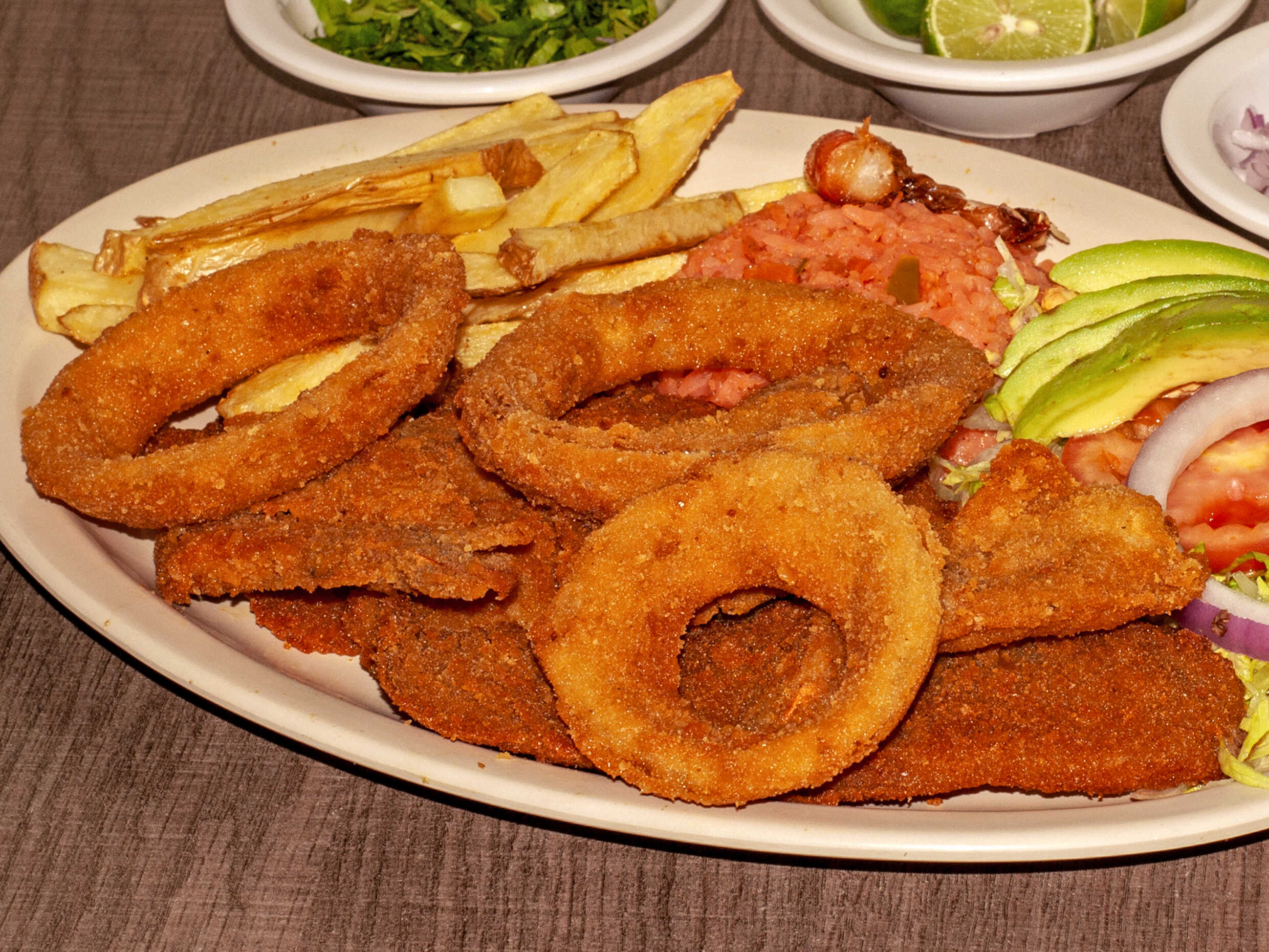 Orden con 3 filetes empanizados.con lechuga 🥬 tomate 🍅 cebolla arroz y papas
