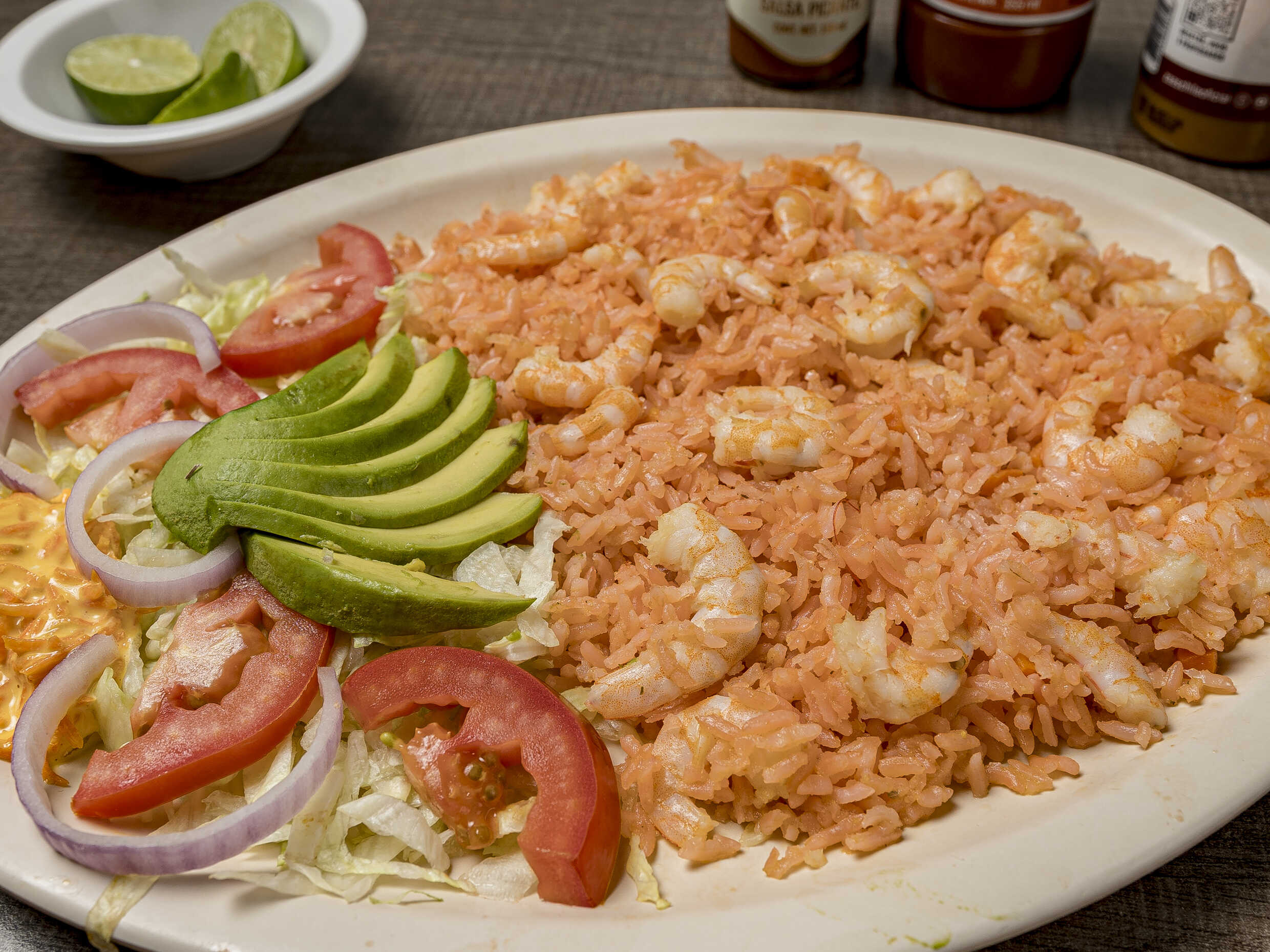 Camarones porción de arroz, Incluye galletas Totopos sobre de habanero limón