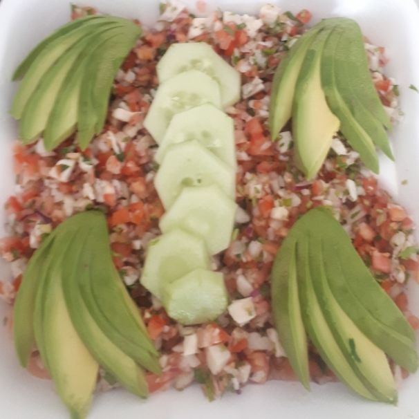 Coctel de Ceviche aguacate cebolla cilantro y catsup. Incluye galletas sobre habanero