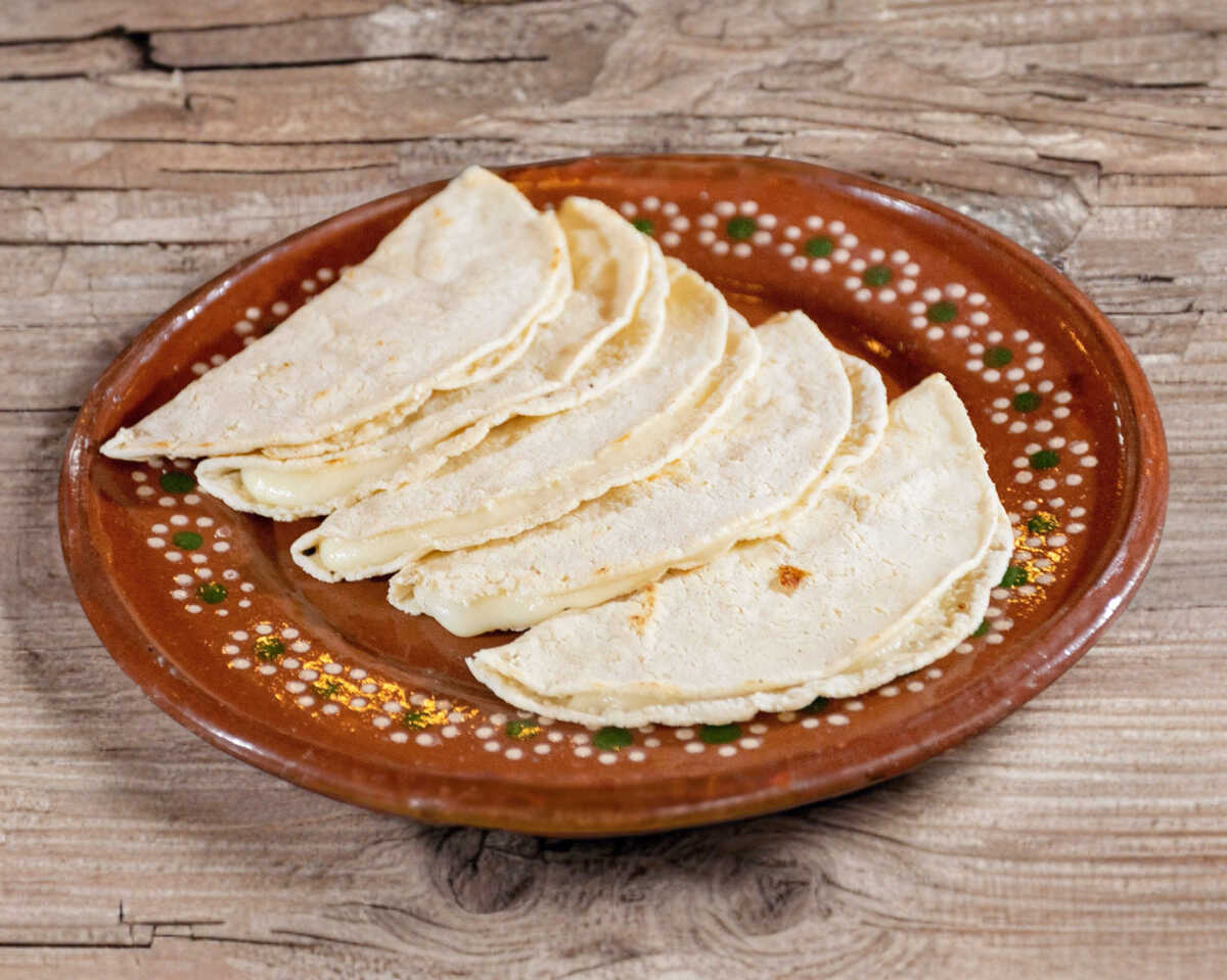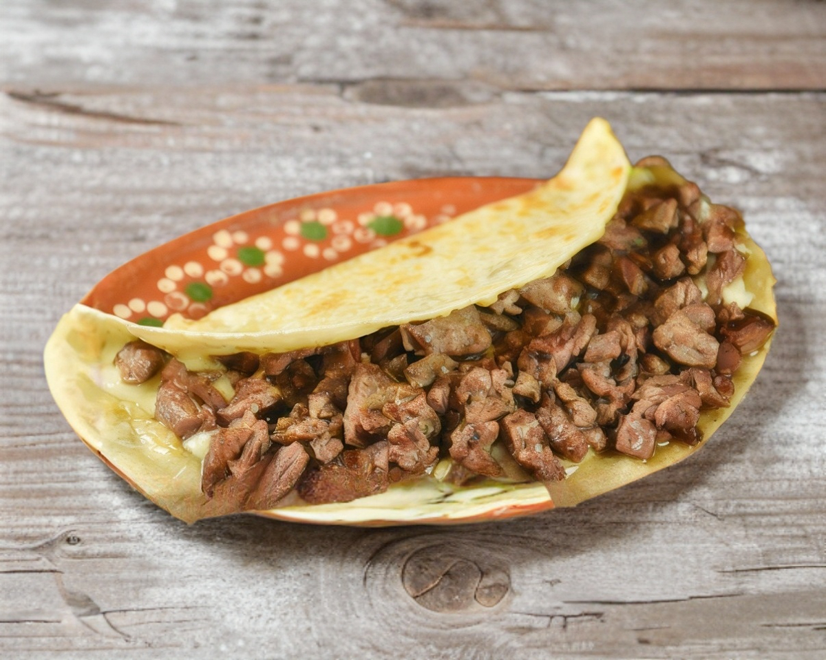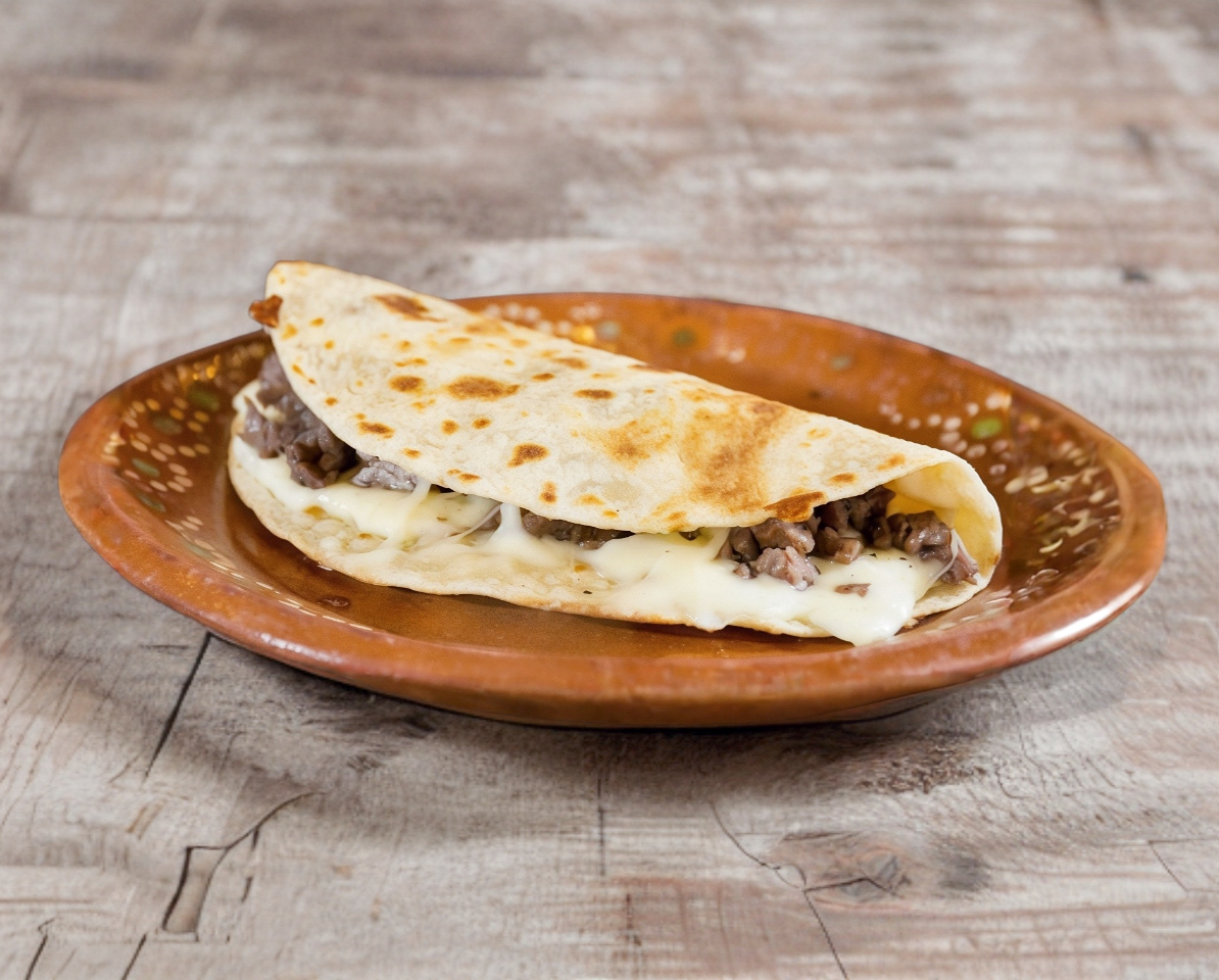 Arrachera, queso asadero fundido en harina o maíz.