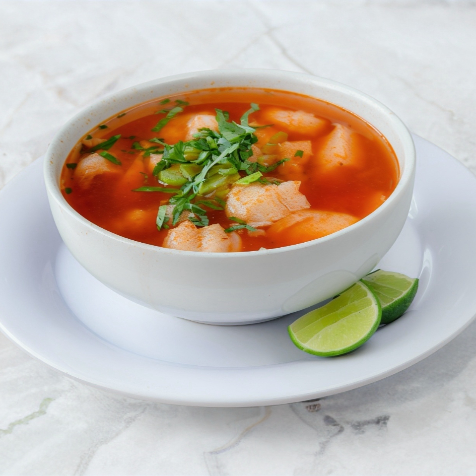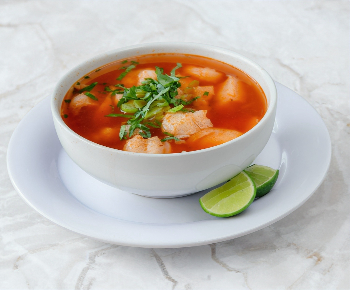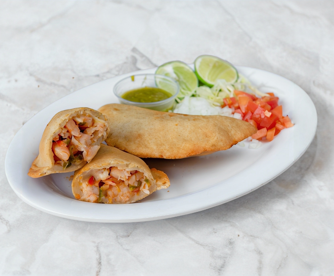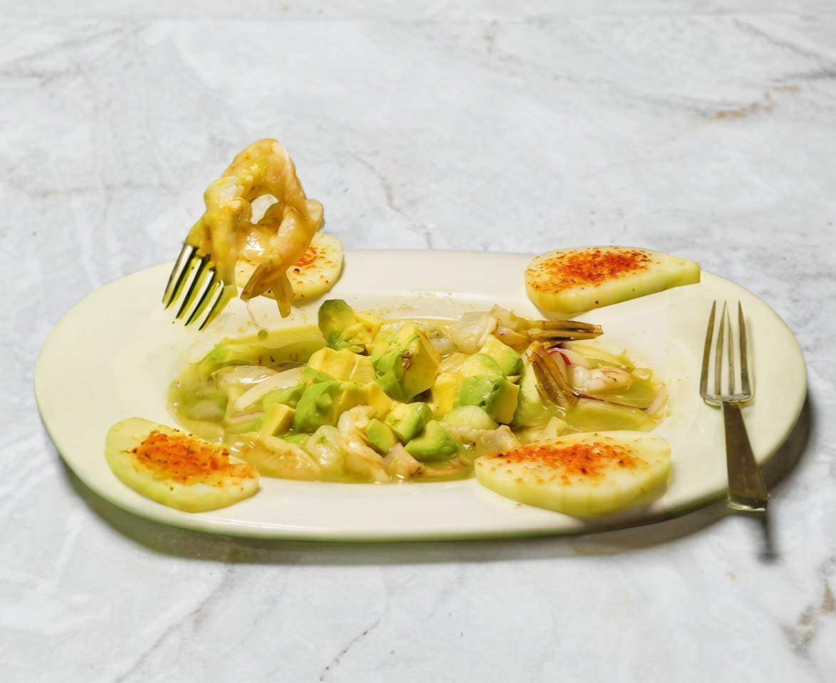 Filete, camarón, pulpo, tomate, cebolla, chile morrón, aceitunas y alcaparras.