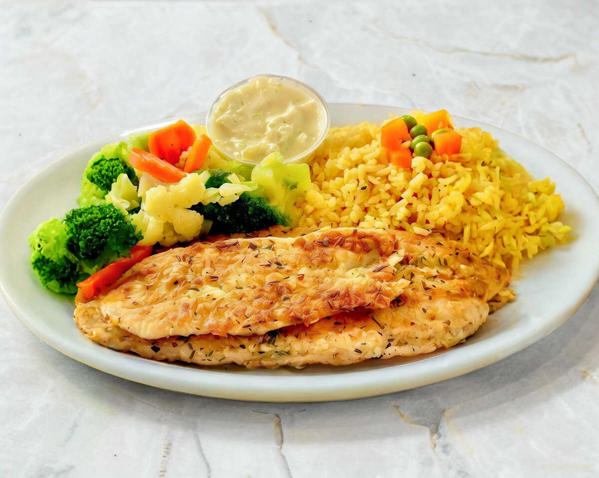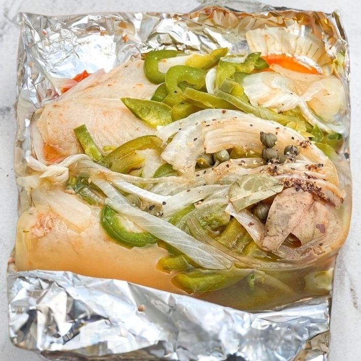 Filete de trucha, tomate, cebolla, chile morrón, aceitunas y alcaparras.