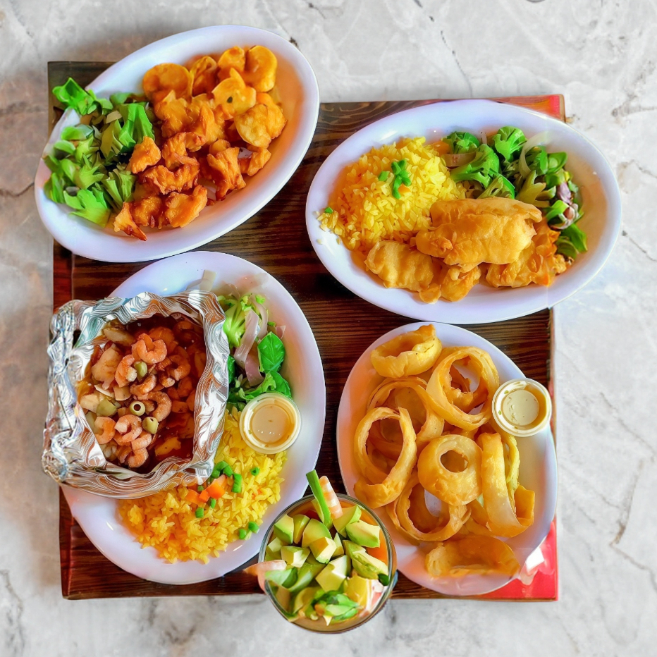 camarones, tiras de pollo, filete de pescado, aros de cebolla