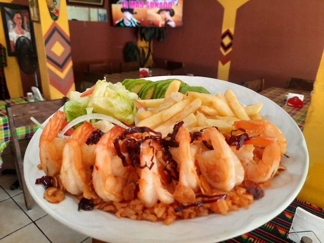 3 CAMARONES RELLENOS DE QUESO ENVUELTOS DE TOCINO ACOMPAÑADOS DE ARROZ ENSALADA DE LECHUGA PAPAS A LA FRANCESA ADERESOS Y 1UN FILETE EMPANIZADO.