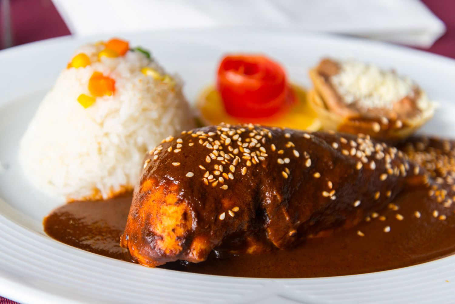 Se acompaña de frijoles refritos, arroz, salsa, quesadilla, cebolla dorada, chile toreado y tortillas.