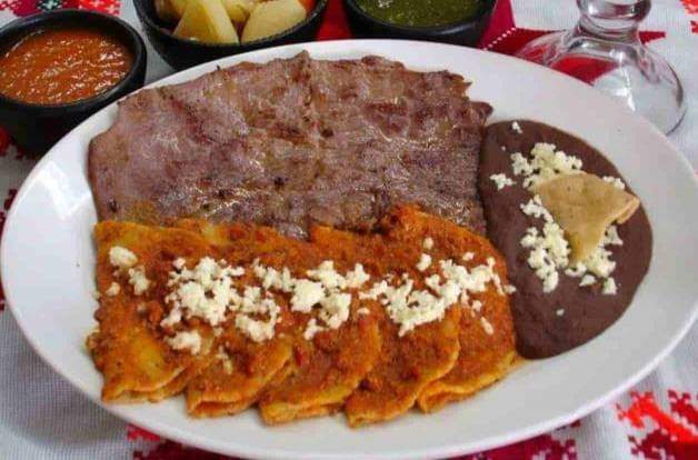 Ensalada de lechuga, frijoles refritos y crema. 3 tortillas rellenas de queso bañadas con chile rojo de árbol acompañado de bistec