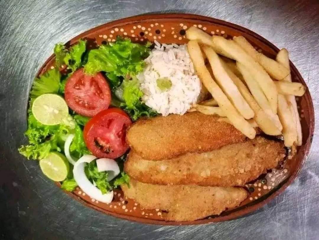 3 filetes empanizados, acompañados de ensalada de lechuga, arroz, papas a la francesa, aderezo y galleta salada