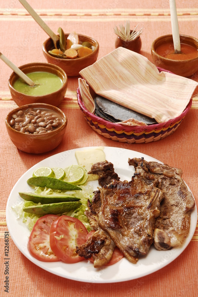 300 GRS DE NEW YORK ASADO SE ACOMPAÑA DE GUACAMOLE TOTOPOS CEBOLLA DORADA CHILE TORNEADO COSTRA DE QUESO SALSA Y TORTILLAS