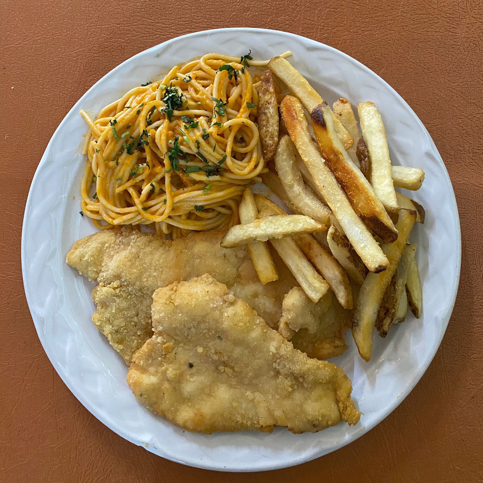 1 filete empanizado · caldito de pescado . arroz . papas a la francesa . ensalada de lechuga