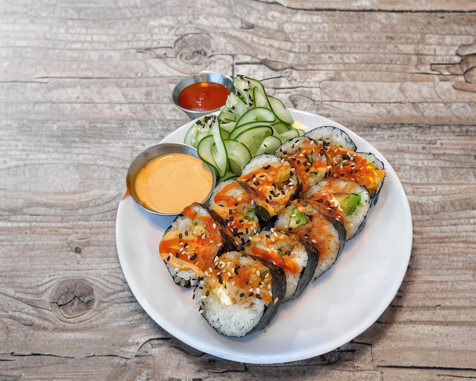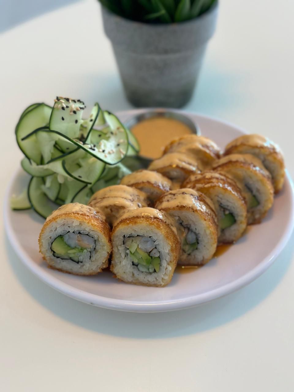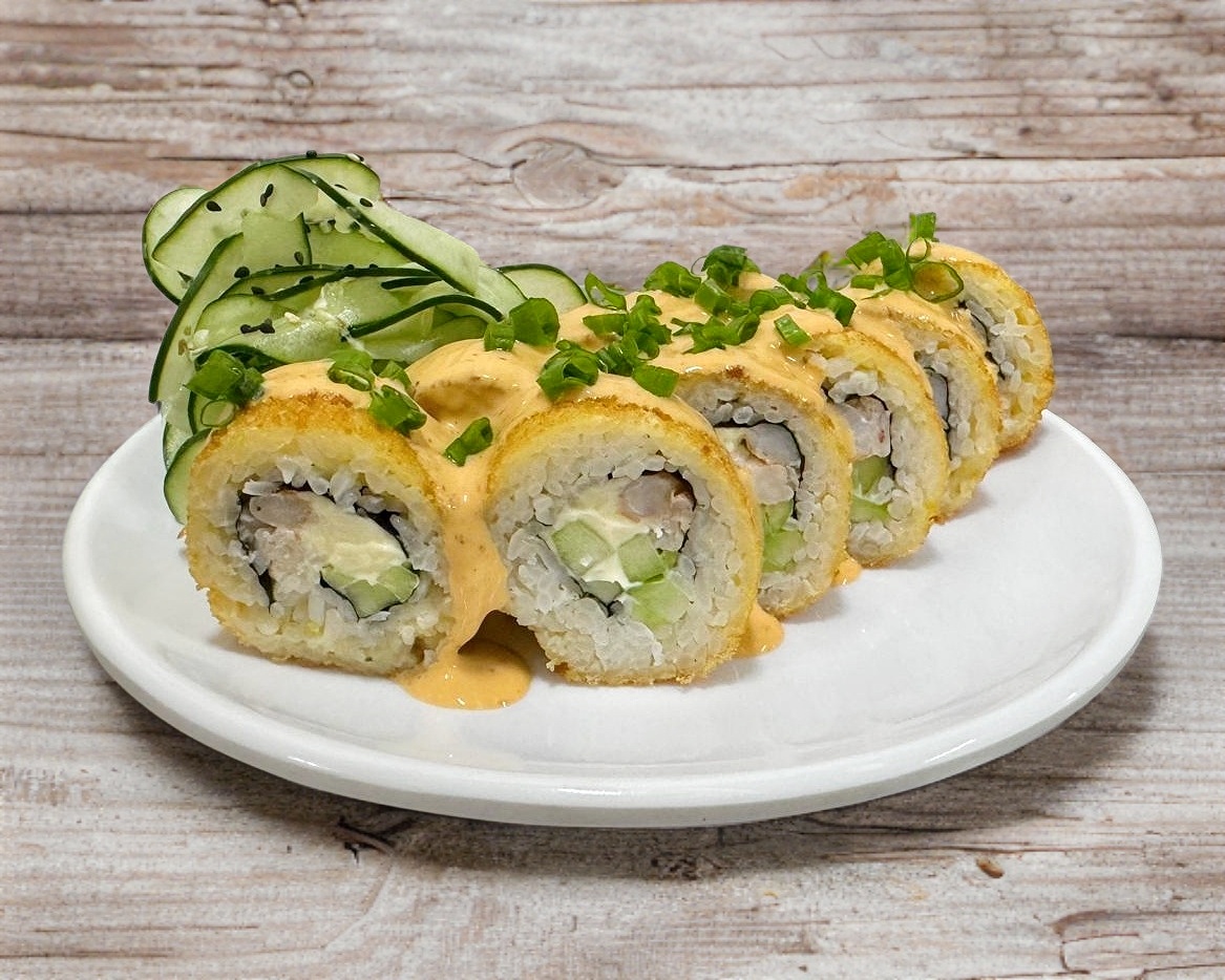 Surimi de cangrejo, aguacate y pepino; bañado en aderezo chipotle, con un toque de shichimi Especias japonesas.