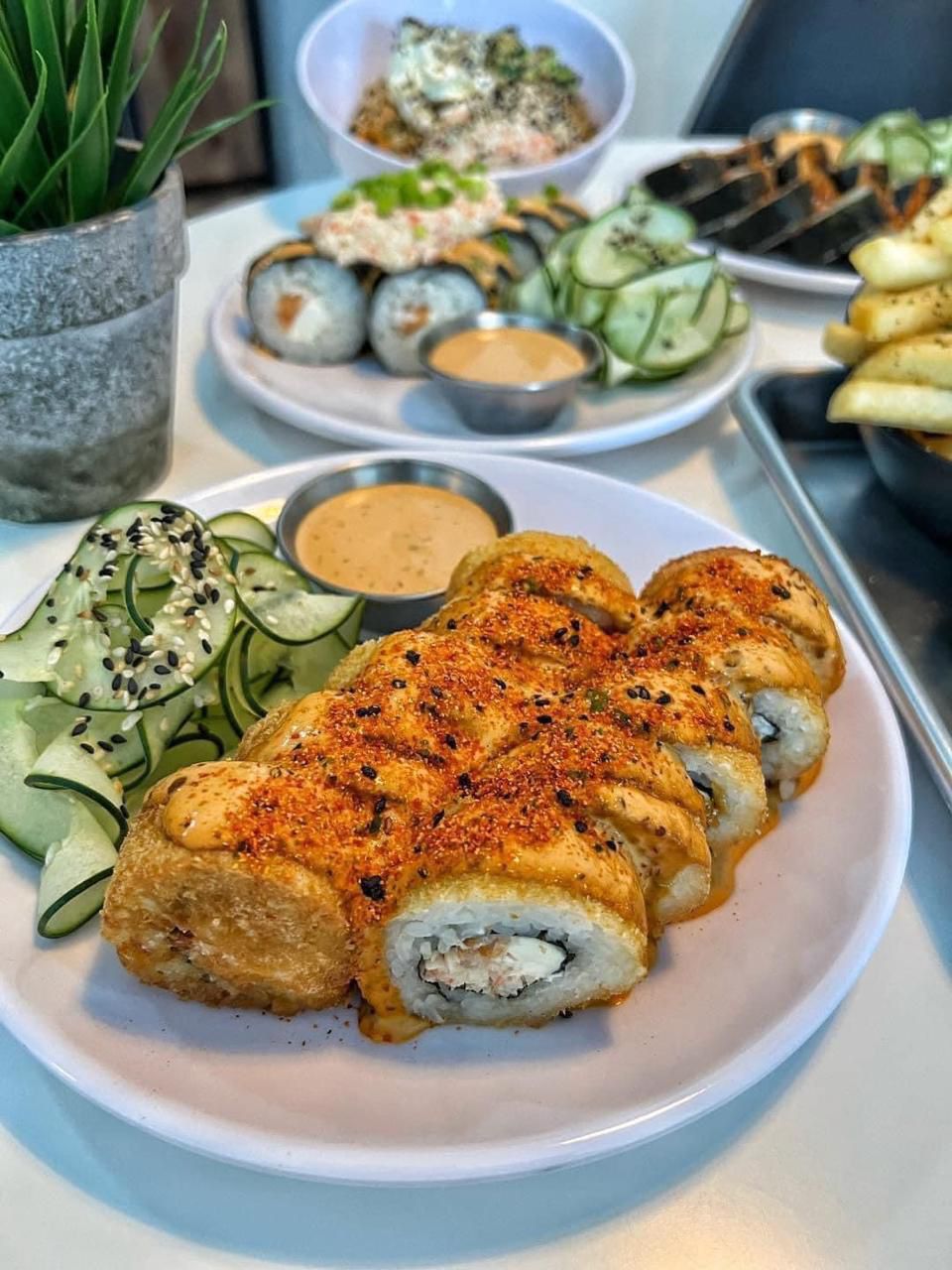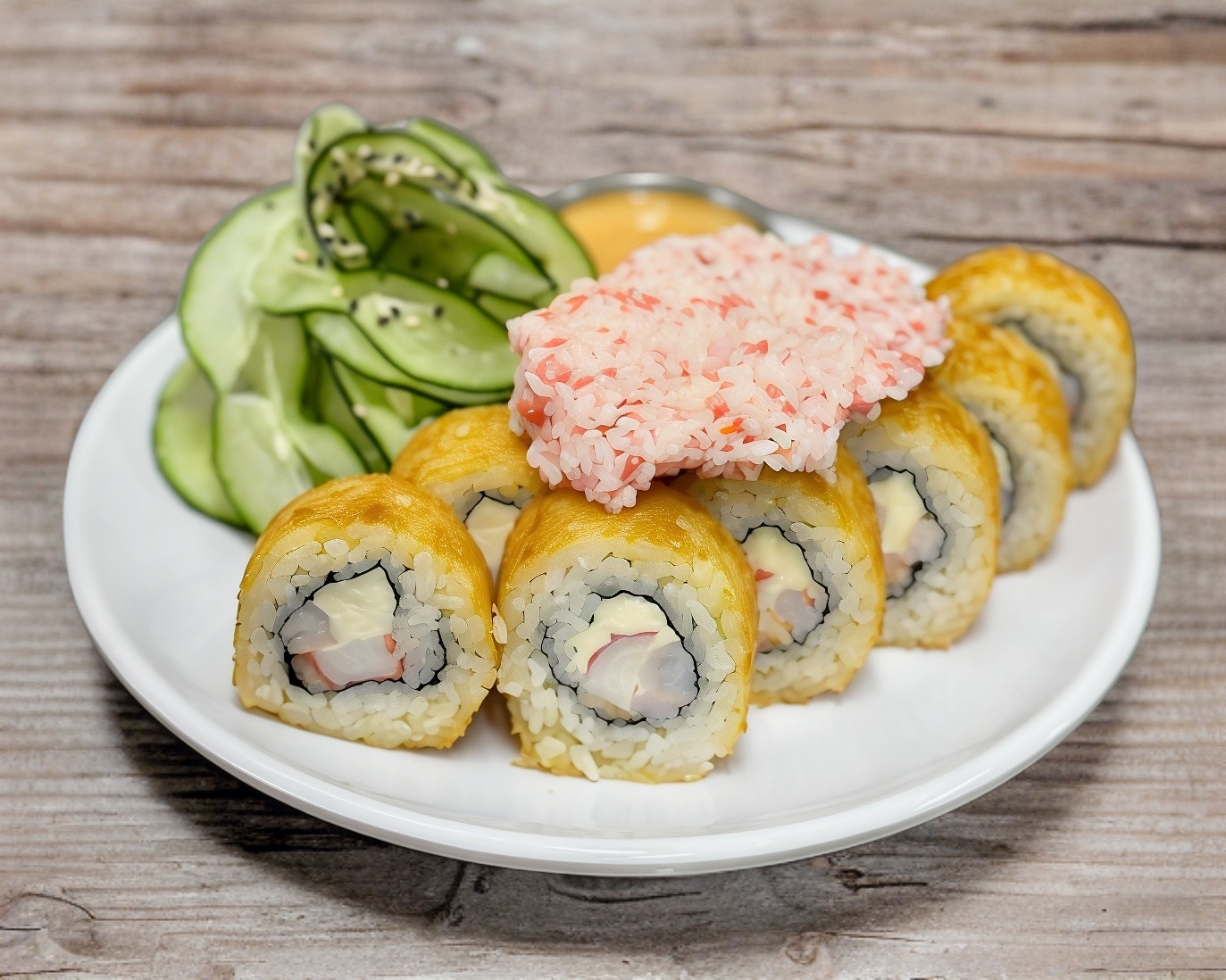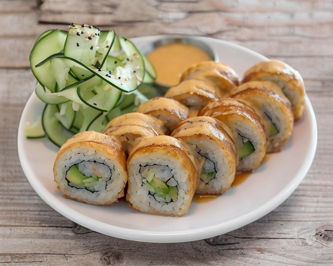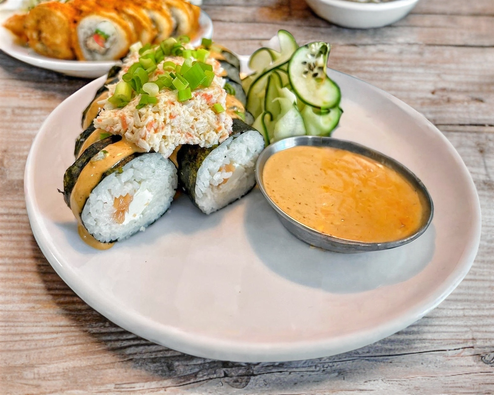 Surimi de cangrejo, aguacate y pepino; bañado en aderezo chipotle, con un toque de shichimi Especias japonesas.